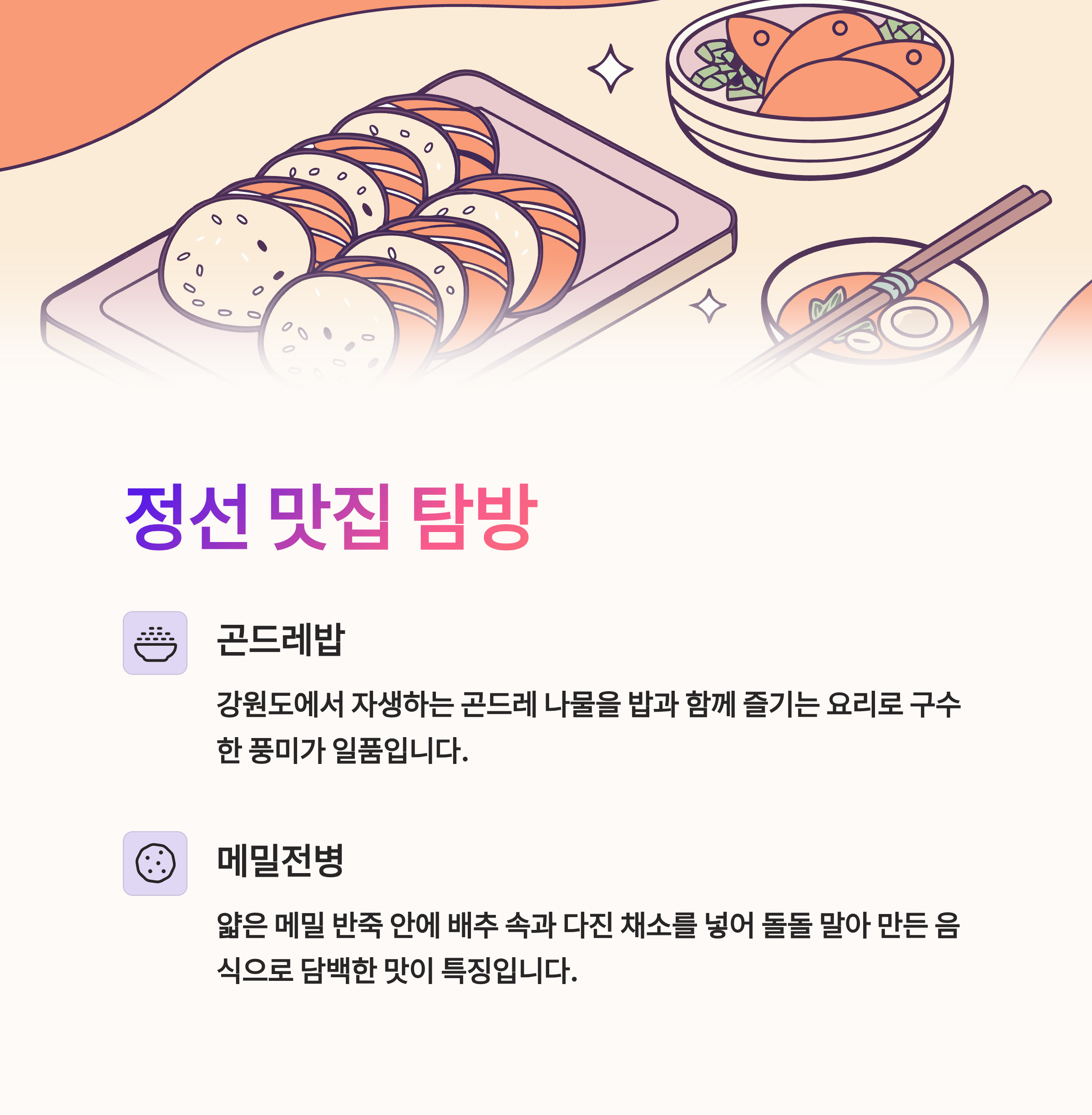 | 아리랑마을(정선아리랑시장) | 곤드레밥, 메밀전병 등 맛보장! |