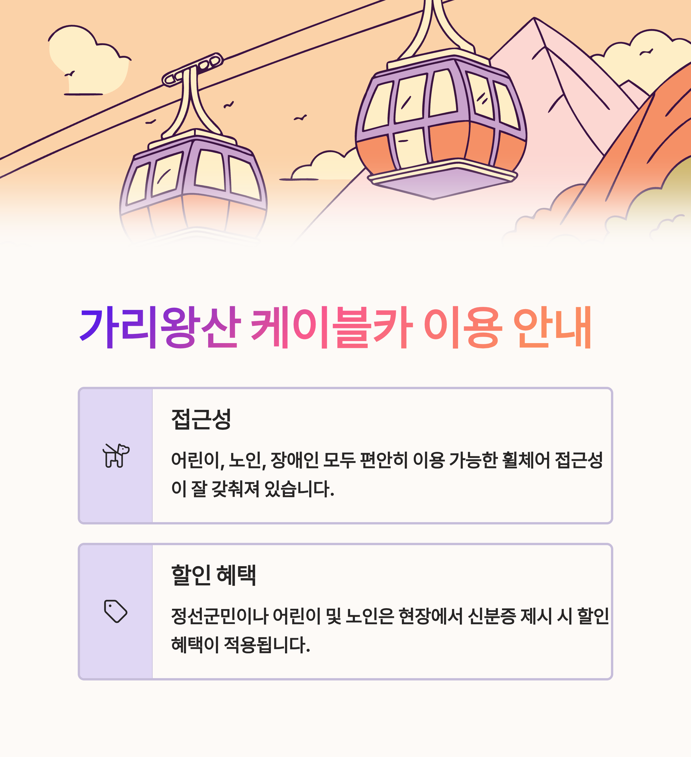 | 가리왕산 케이블카는 어린이, 노인, 장애인 모두 편안히 이용할 수 있는 시설입니다. 탑승 공간이 넓고, 입구에서부터 차량 이동이 가능한 휠체어 접근성이 잘 갖춰져 있습니다. 어린이와 노인들을 위한 안전 장치와 직원의 도움 서비스가 제공됩니다. 또한 케이블카 정상에서는 실내 카페와 화장실 등 편의시설이 운영되고 있어 휴식과 간식을 즐기기에도 좋은 환경입니다. 정선군민이나 할인 대상자(어린이 및 노인)는 현장에서 신분증을 제시하면 할인 혜택도 적용됩니다. |