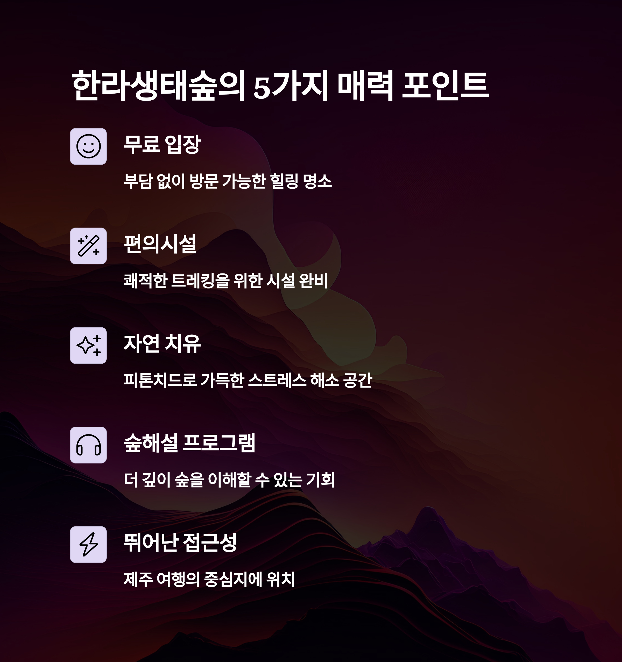 제주도의 중심에서 누리는 고요한 자연의 소리와 피톤치드는 스트레스를 해소하는 데 매우 효과적입니다.