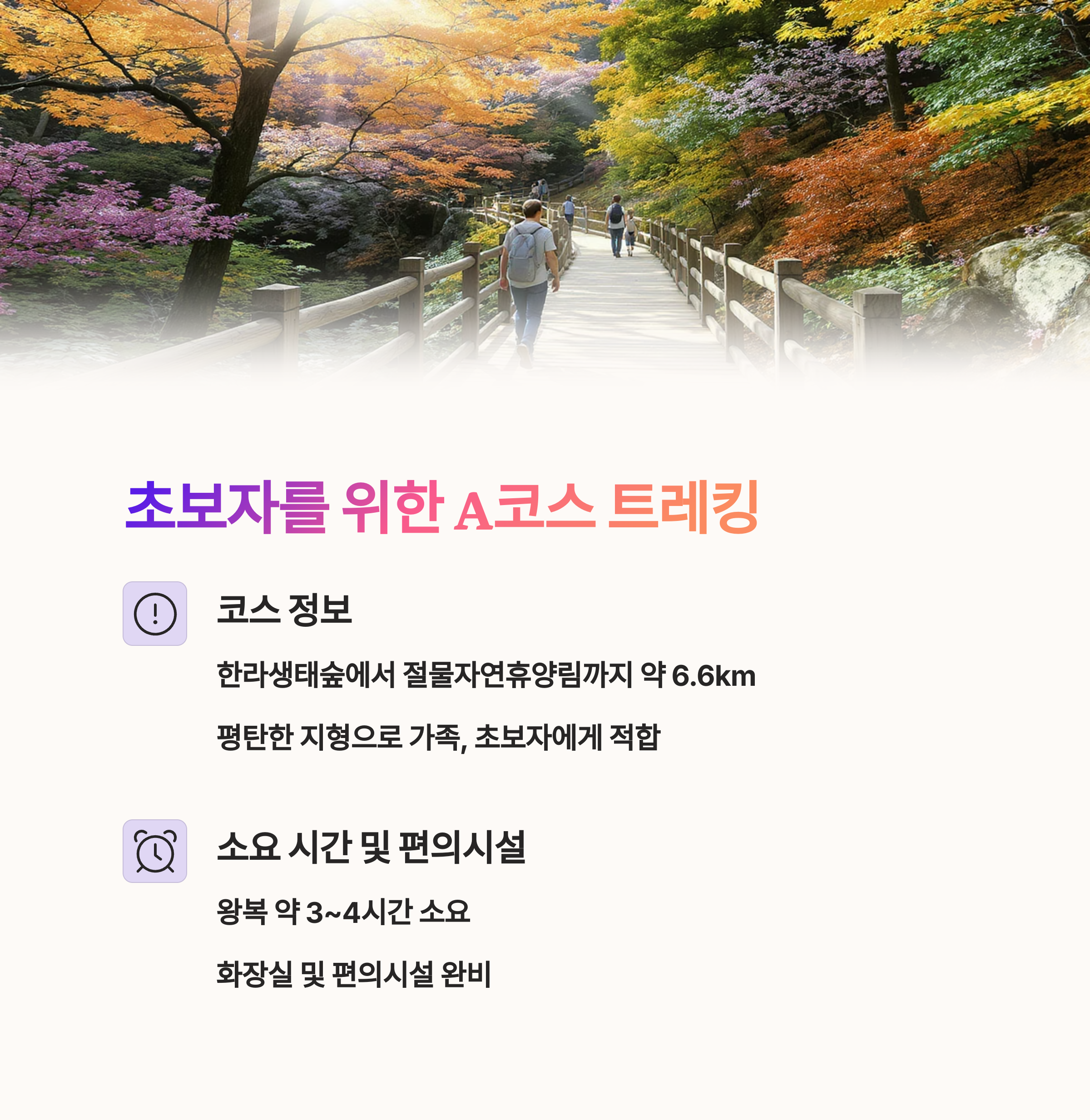 더불어, 6km A코스를 중심으로 이어지는 트레킹 코스는 초보자와 가족 단위 방문객에게 편리하면서도 알찬 경험을 제공합니다.