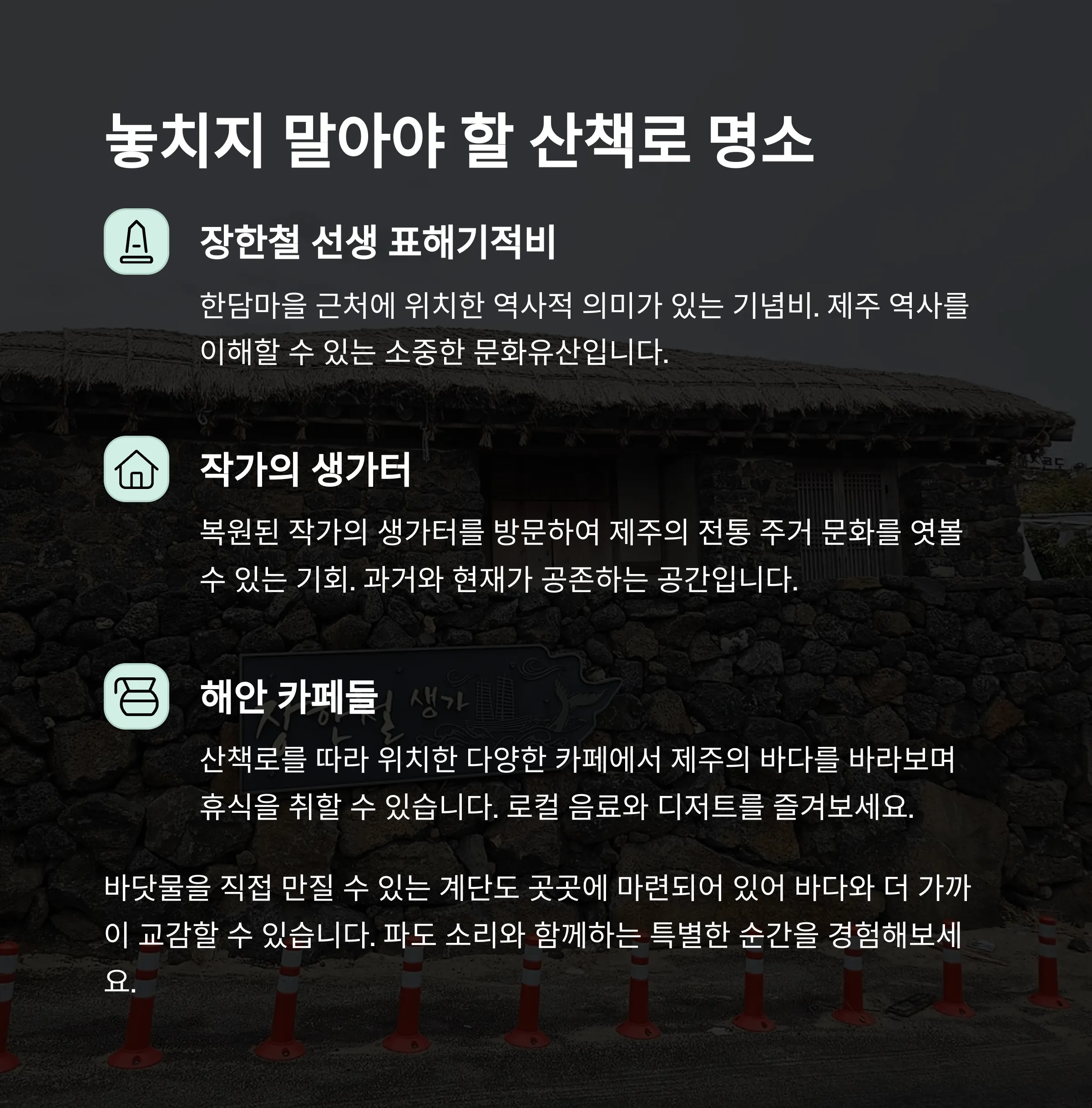 | 주요 명소 | 장한철 표해기적비, 애월 카페거리 해변 카페 |