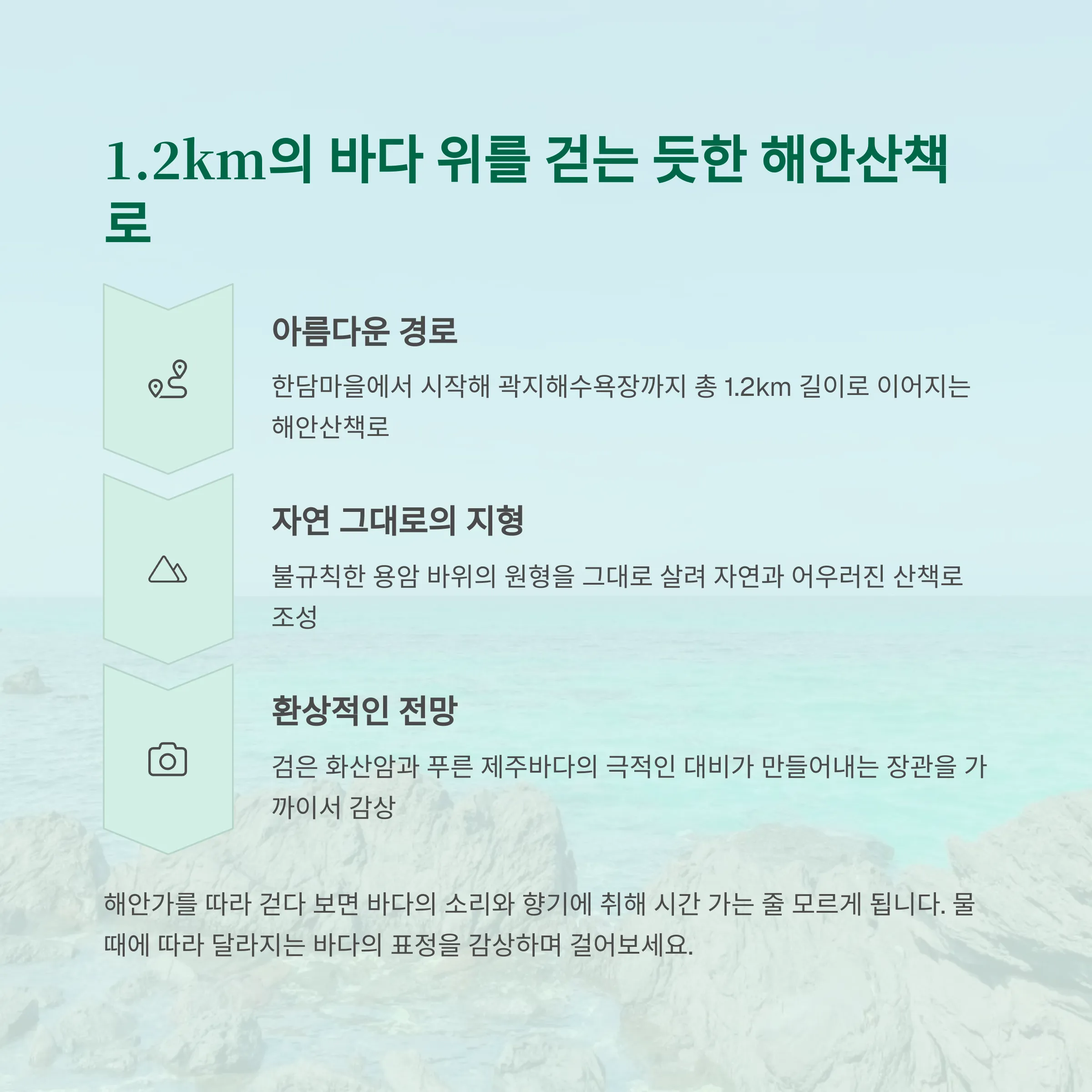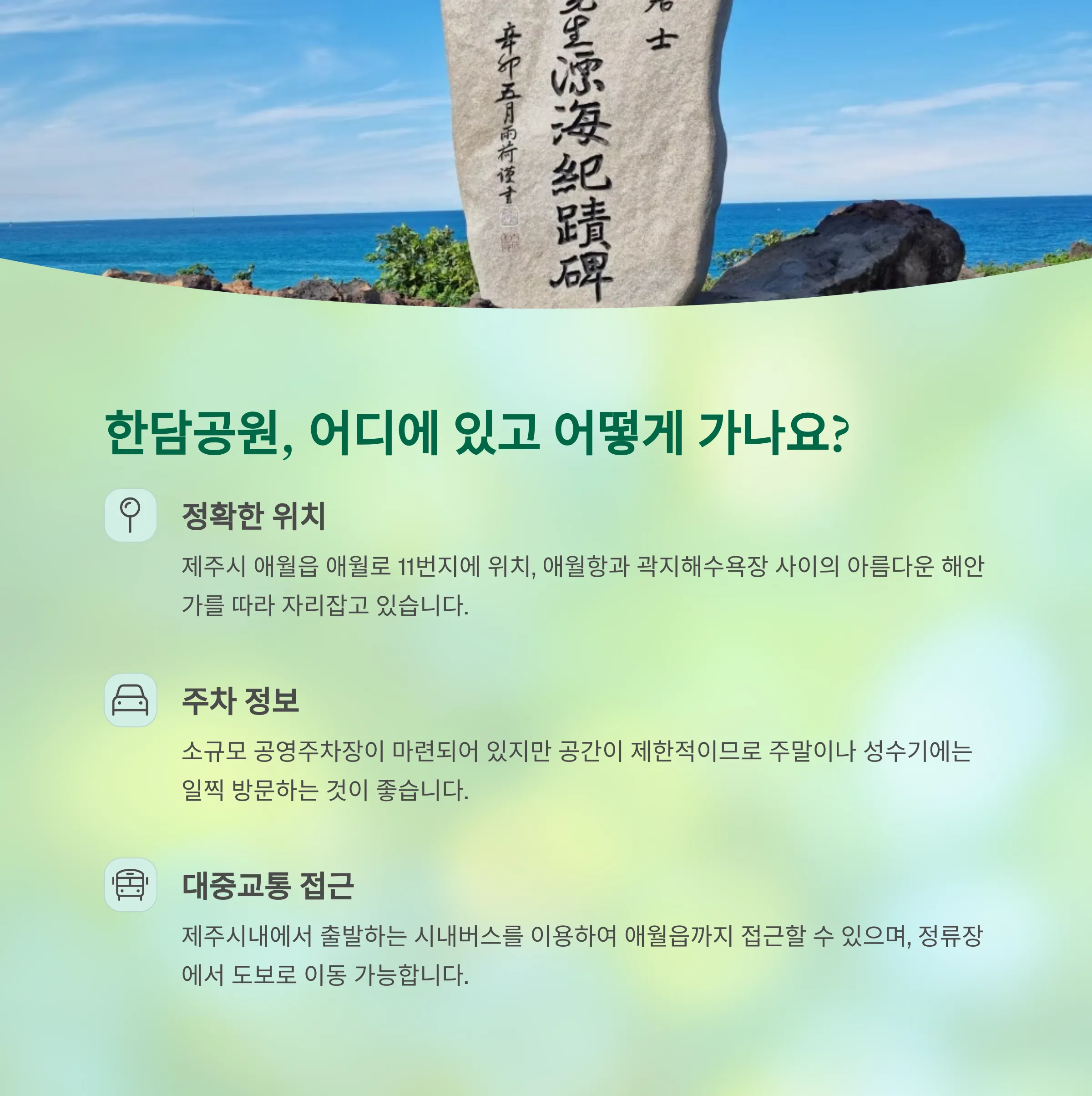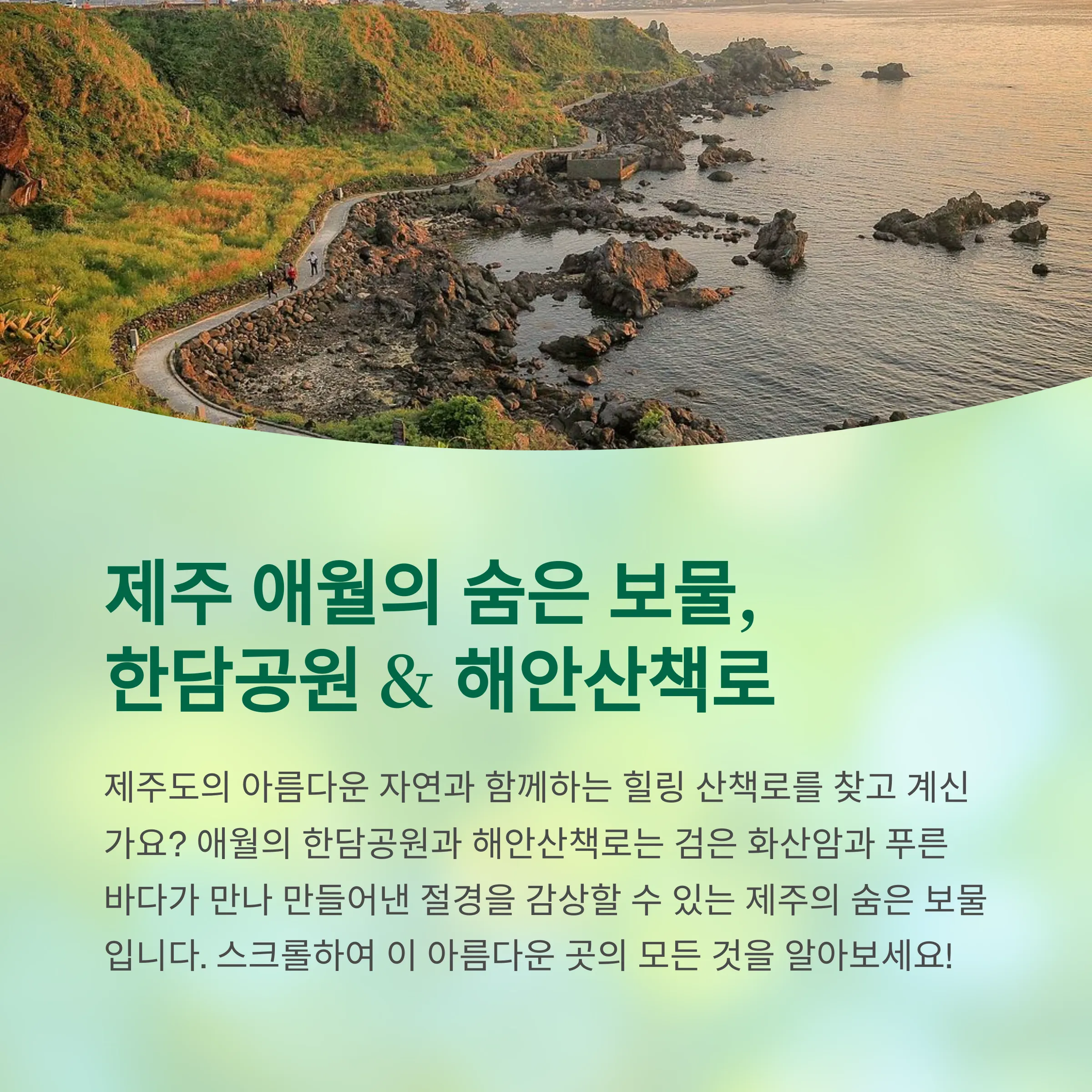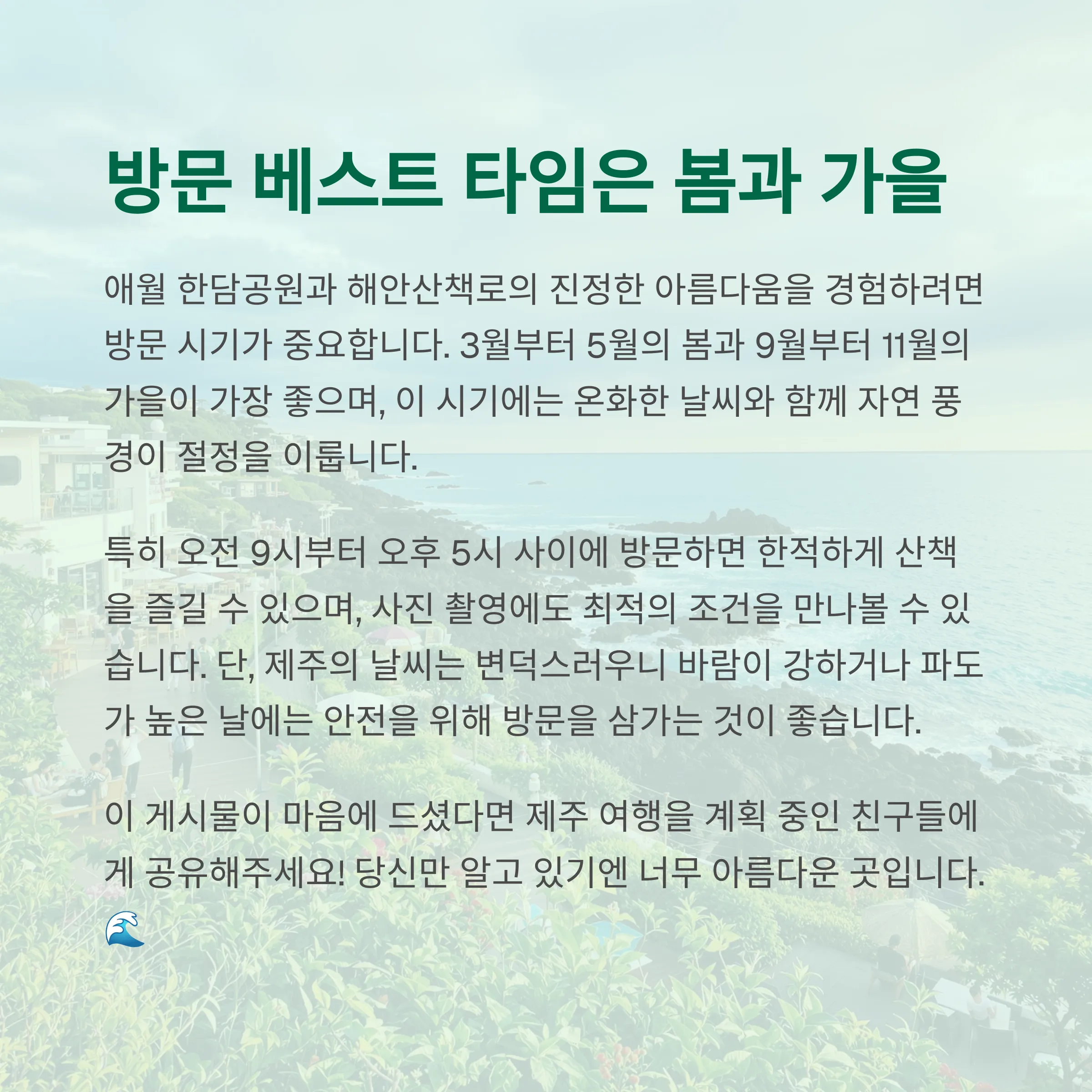 한담공원과 해안산책로는 자연과 사람이 조화를 이루며 산책하기에 최적화된 제주도의 보석 같은 명소입니다.