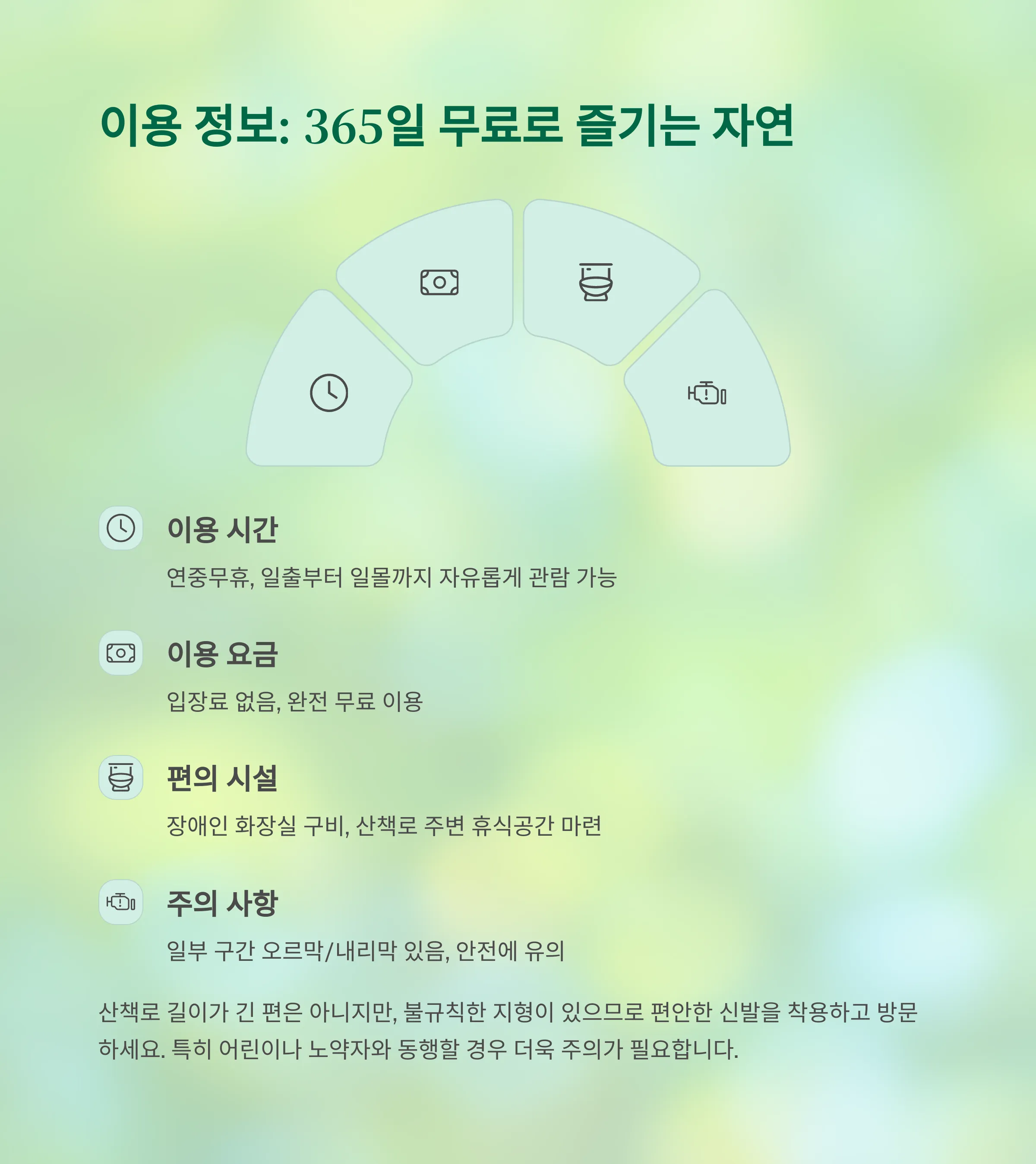 아이들과도 함께하기 좋은 완만한 경로로, 가족 단위 방문객에게 강력 추천됩니다!