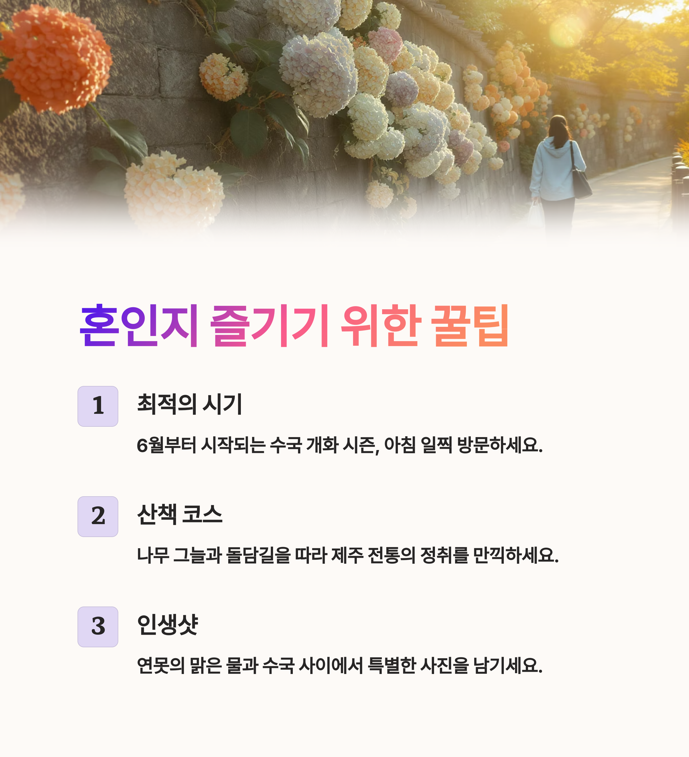 | 혼인지의 특별함을 누리기 위한 팁 몇 가지를 알려드립니다. 첫째, 6월부터 시작되는 수국 개화 시즌에는 아침 일찍 방문해 한적한 분위기와 더불어 싱그러운 연못 풍경을 감상해 보세요. 둘째, 혼인지 부근에 있는 나무 그늘과 돌담길을 따라 산책 코스를 스케치하며 제주 전통의 정취를 만끽하시면 더 좋습니다. 셋째, 혼인지 전설과 관련된 설명물이 잘 마련되어 있으므로 시간을 내어 신화와 역사를 탐구해 보세요. 넷째, 사진 촬영을 좋아하신다면 연못의 맑은 물과 수국 사이에서 나만의 인생샷을 남기는 것도 잊지 마세요. 마지막으로 혼인지 방문 후 주변에 있는 성산일출봉과 섭지코지로 연계 여행하며 제주 동쪽의 매력을 모두 경험해 보세요. |