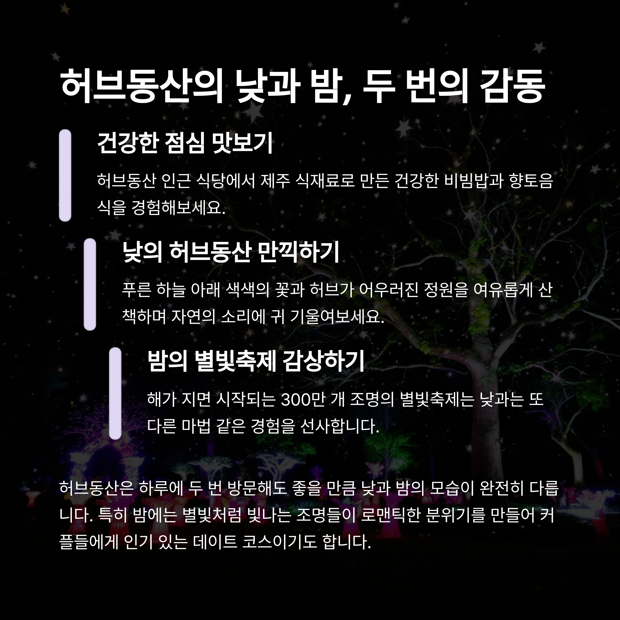 제주 동쪽과 서쪽 주요 명소를 허브동산과 연계하면 완벽한 여행이 가능합니다.