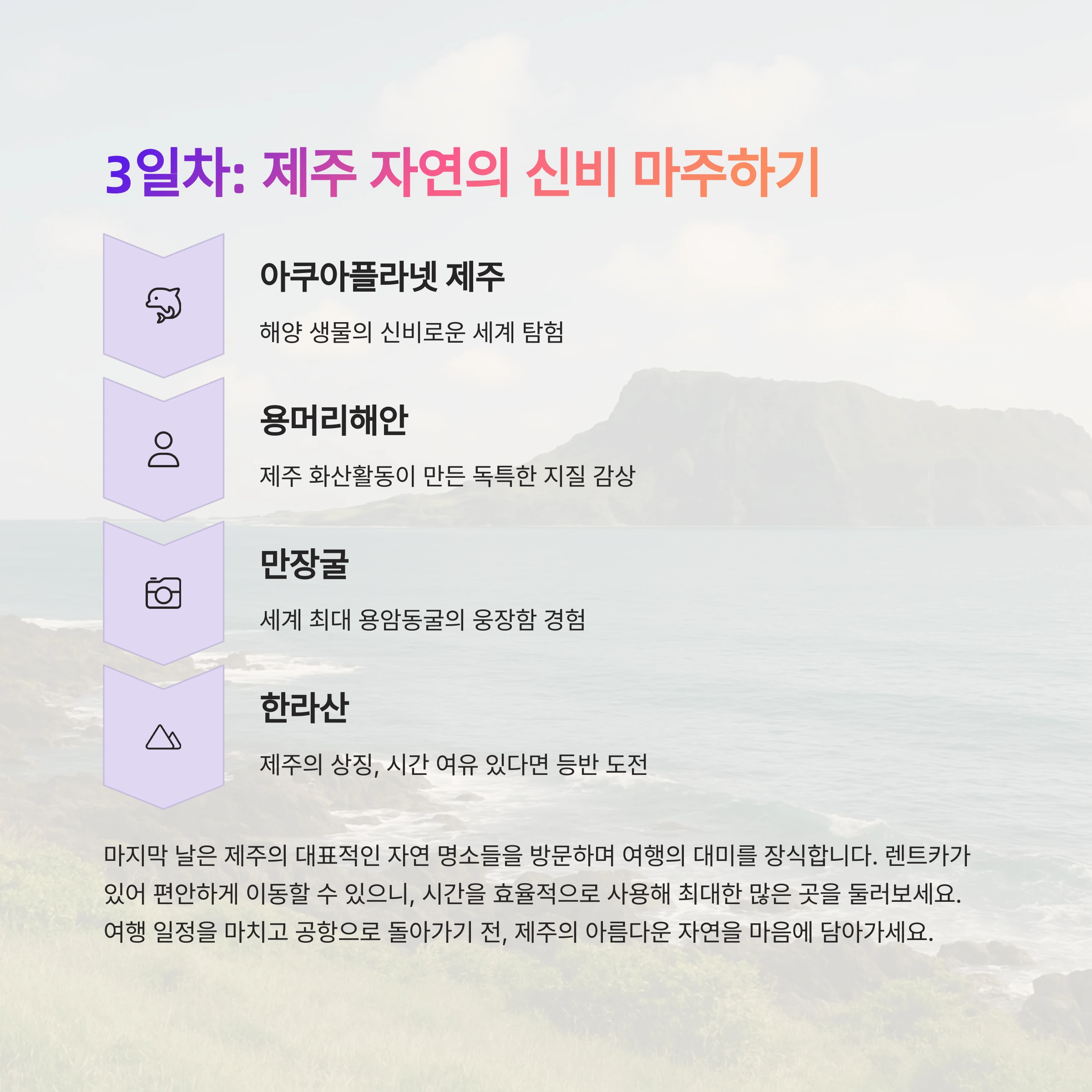 제주도 2박3일 여행코스를 통해 마음껏 자연과 힐링의 조화를 느껴보세요!