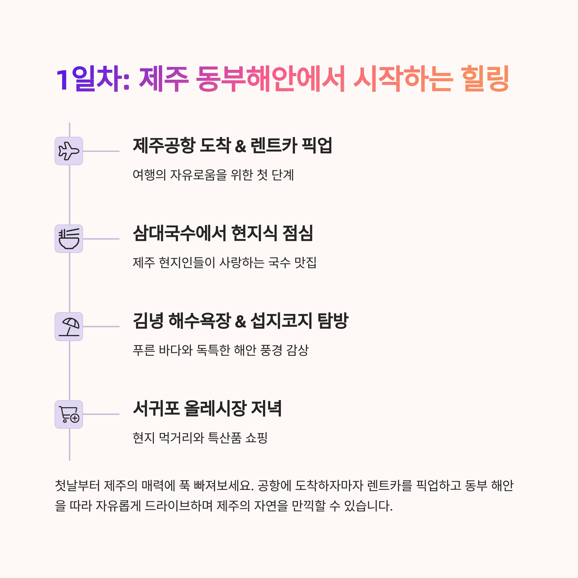 | 제주공항 도착 → 김녕 해수욕장 → 올레시장 | 허브동산 탐방 → 황금 족욕/체험 프로그램 | 아쿠아플라넷 → 용머리해안 → 만장굴 |