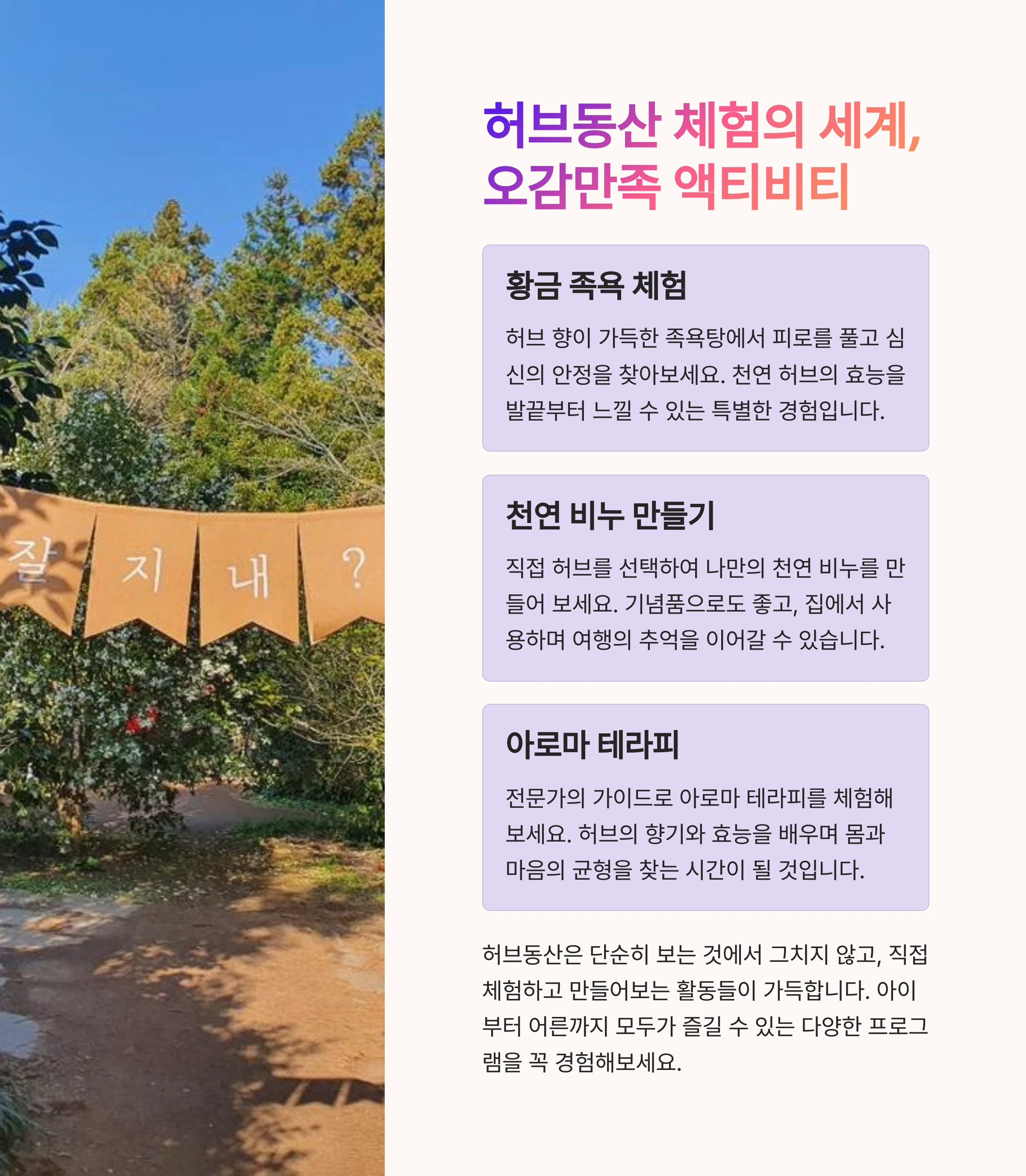 허브동산은 단순한 관광지를 넘어 마음과 몸의 안정을 돕는 힐링 공간입니다.