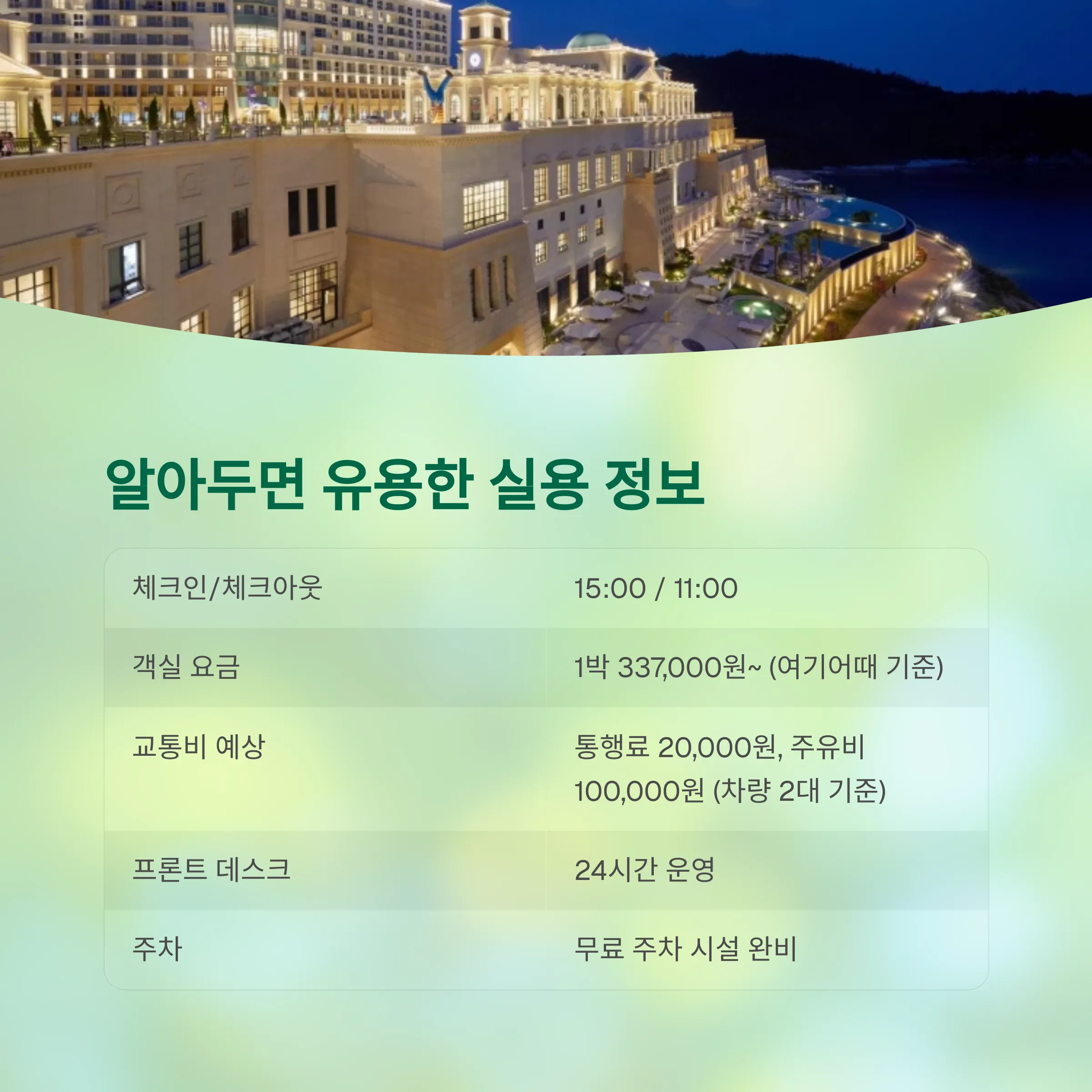 | 숙소 비용 (1박 기준) | 337,000원~ (여기어때 기준) |