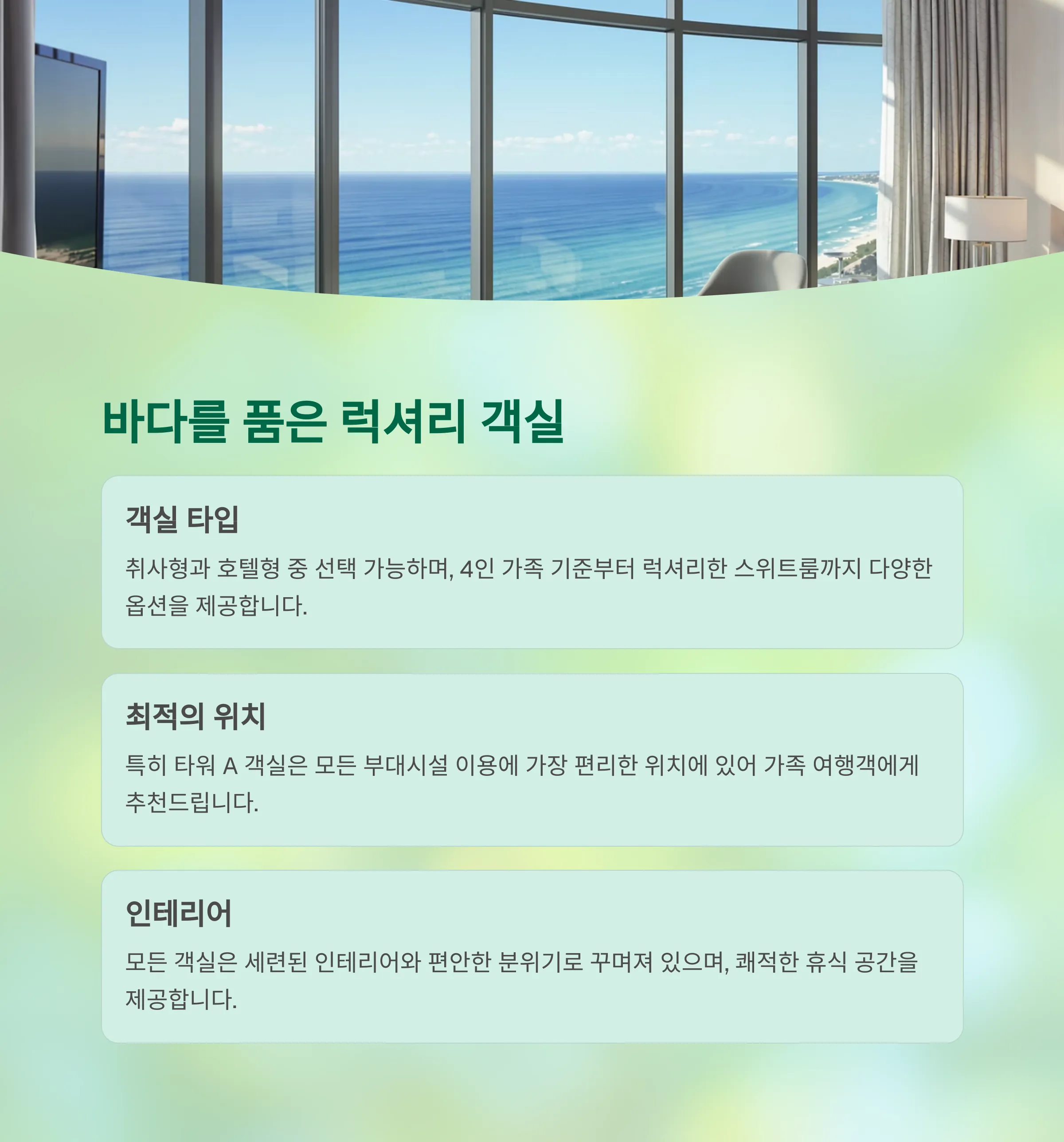 | 가족 여행을 위해 가장 적합한 숙소를 선택하려면 TIP을 확인하세요. 부모님과 함께라면 부대시설과 가까운 A타워 객실이 최고의 선택입니다. 요리를 할 계획이 있다면 취사형 객실이 특히 편리합니다. 호텔형 객실을 선택하면 더욱 고급스러운 숙박 경험을 할 수 있습니다. 가격대와 원하는 부대시설 접근성을 고려해 최적의 숙소를 선택하세요. 객실을 예약할 때 체크인, 체크아웃 시간을 숙지하고 추가 요금 발생을 방지해야 합니다. |