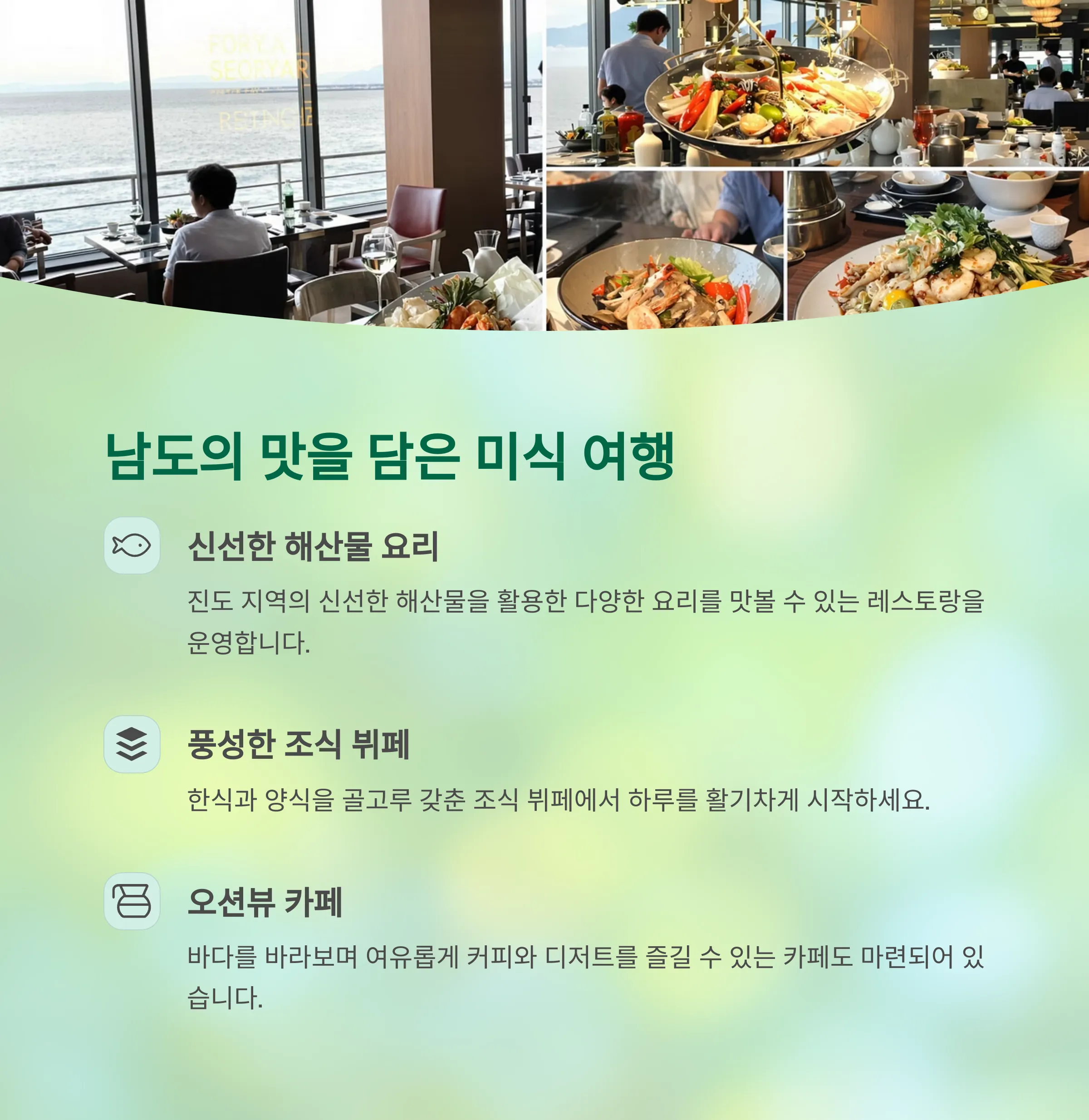 진도 쏠비치 리조트는 아름다운 남해 바다를 감상할 수 있는 지중해풍 리조트로 유명합니다.