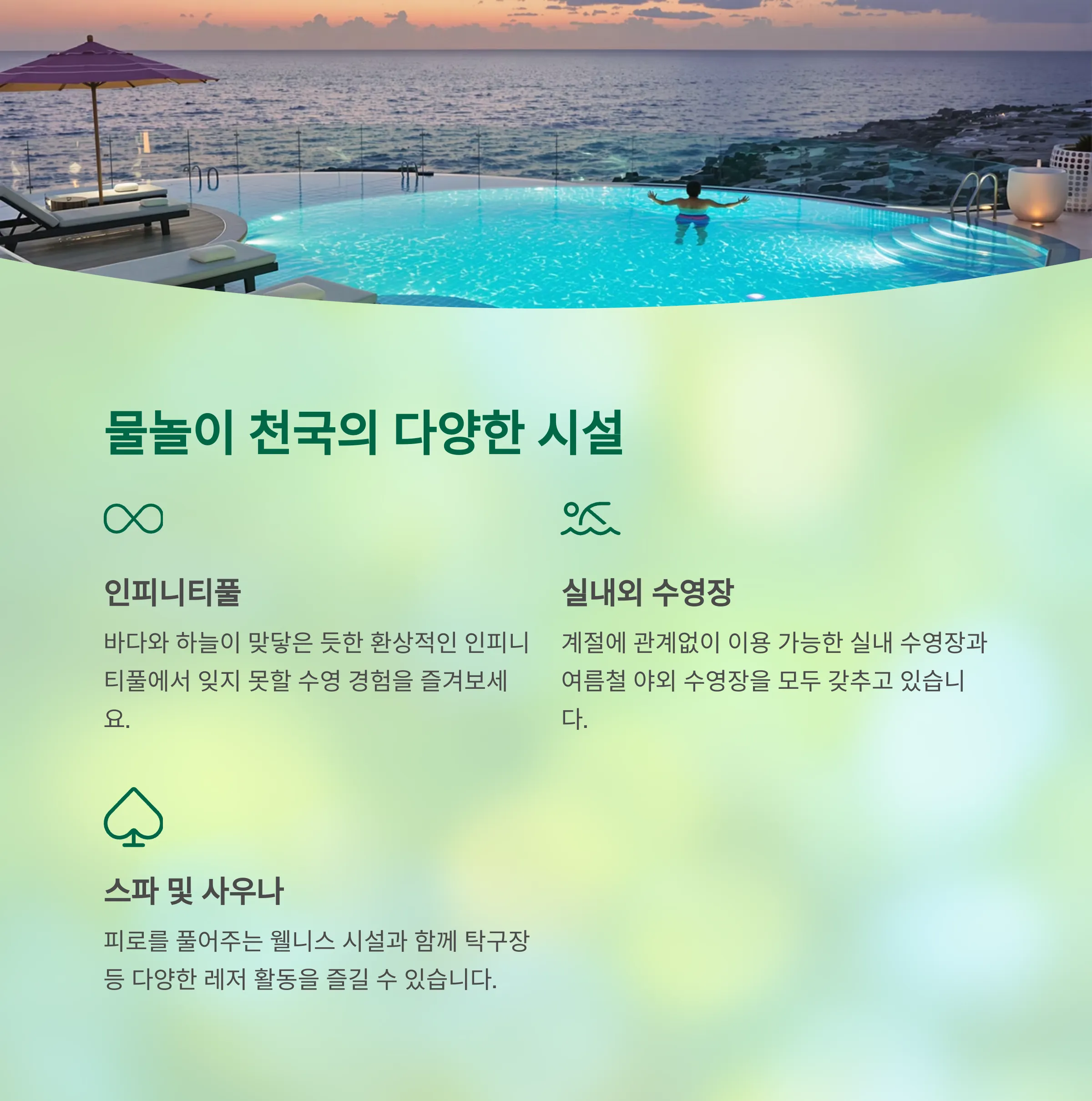 인피니티풀과 같은 특별한 부대시설로 이곳만의 경험을 제공받을 수 있습니다.