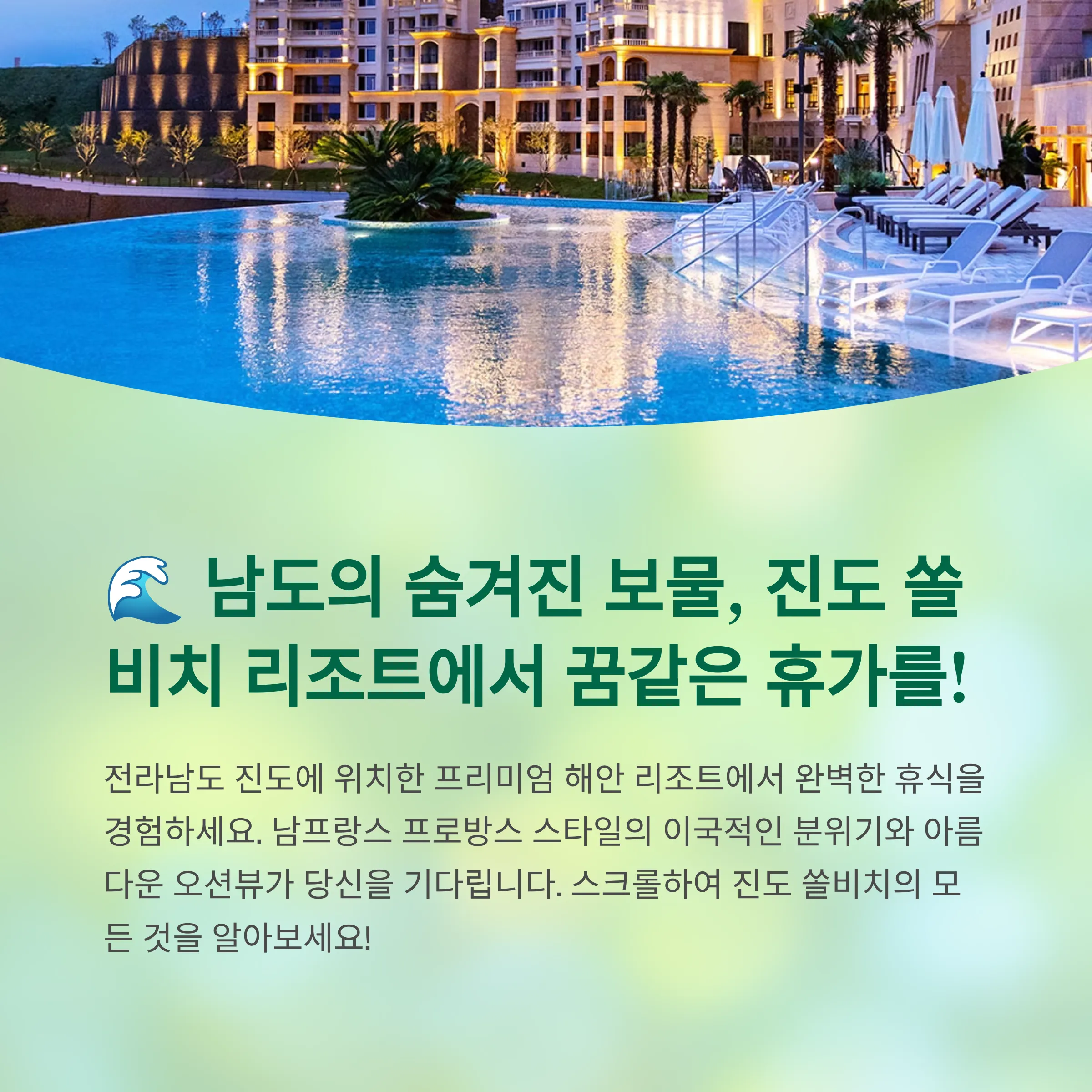 일상에서 벗어나 진정한 여유를 느낄 수 있는 진도 쏠비치에 대한 정보를 들고 왔습니다.