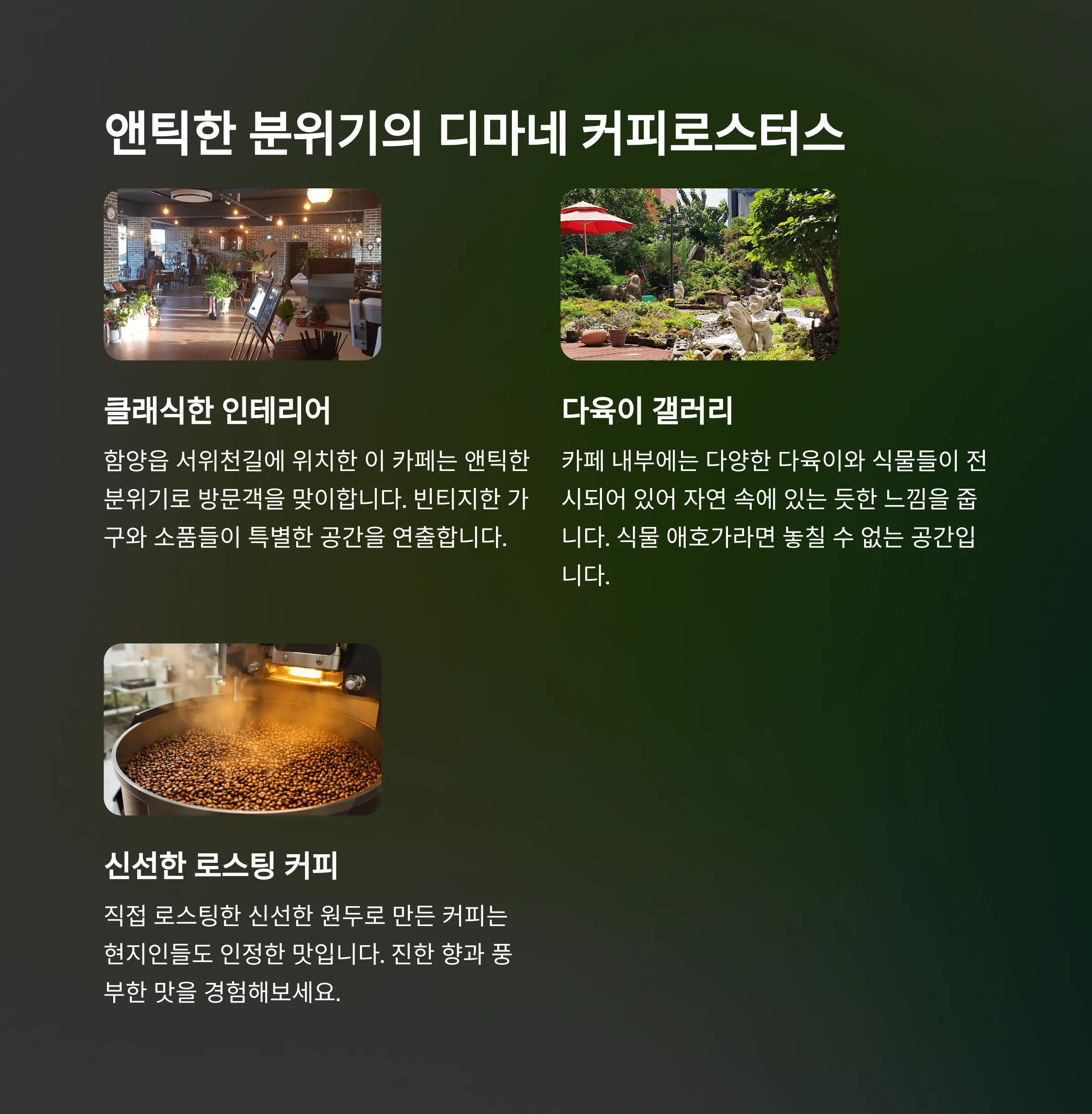 | 디마네 커피로스터스 | 앤틱한 분위기가 주는 힐링, 다육이 전시 | 경남 함양군 함양읍 서위천길 11 |