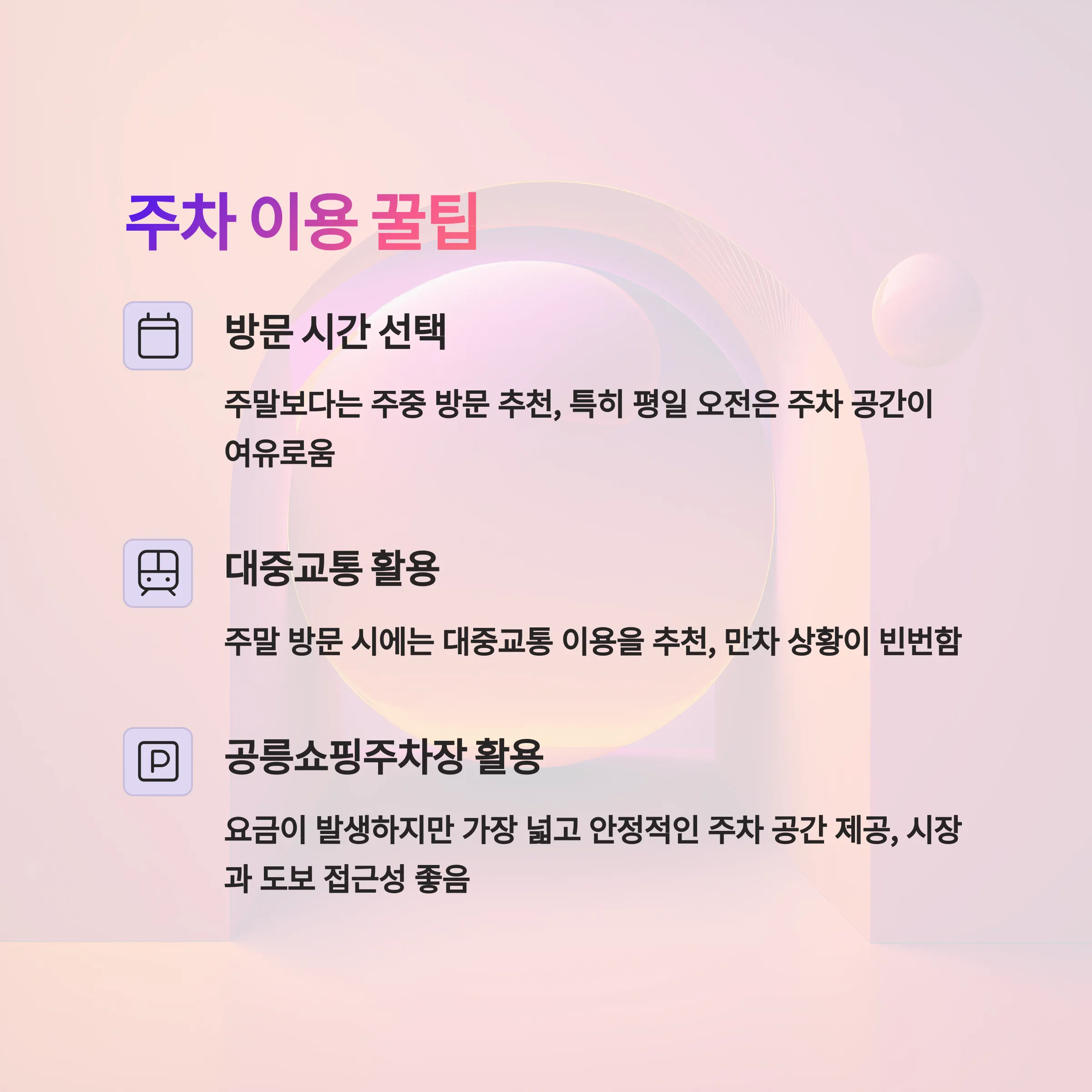 1. 주말 방문 시에는 대중교통 이용을 추천하며, 만차 상황을 대비하세요.