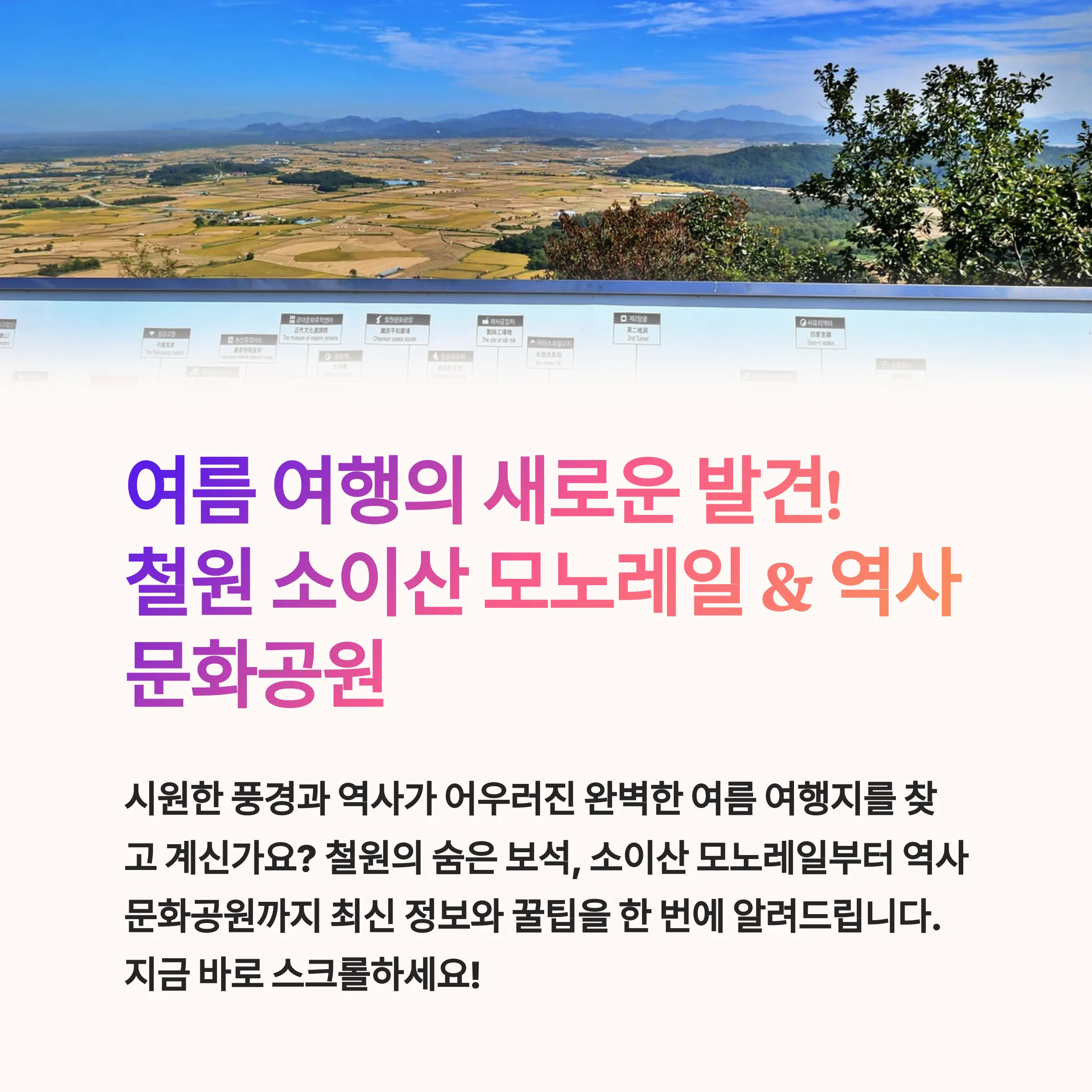 여름 여행 계획, 어디로 갈지 고민하고 계신가요? 시원한 풍경과 역사 이야기가 어우러진 곳을 찾고 있다면 오늘 소개드릴 코스가 딱입니다! 철원 소이산 모노레일부터 철원역사문화공원까지, 최신 정보 와 꿀팁을 준비했으니 지금 바로 함께 확인해보세요!