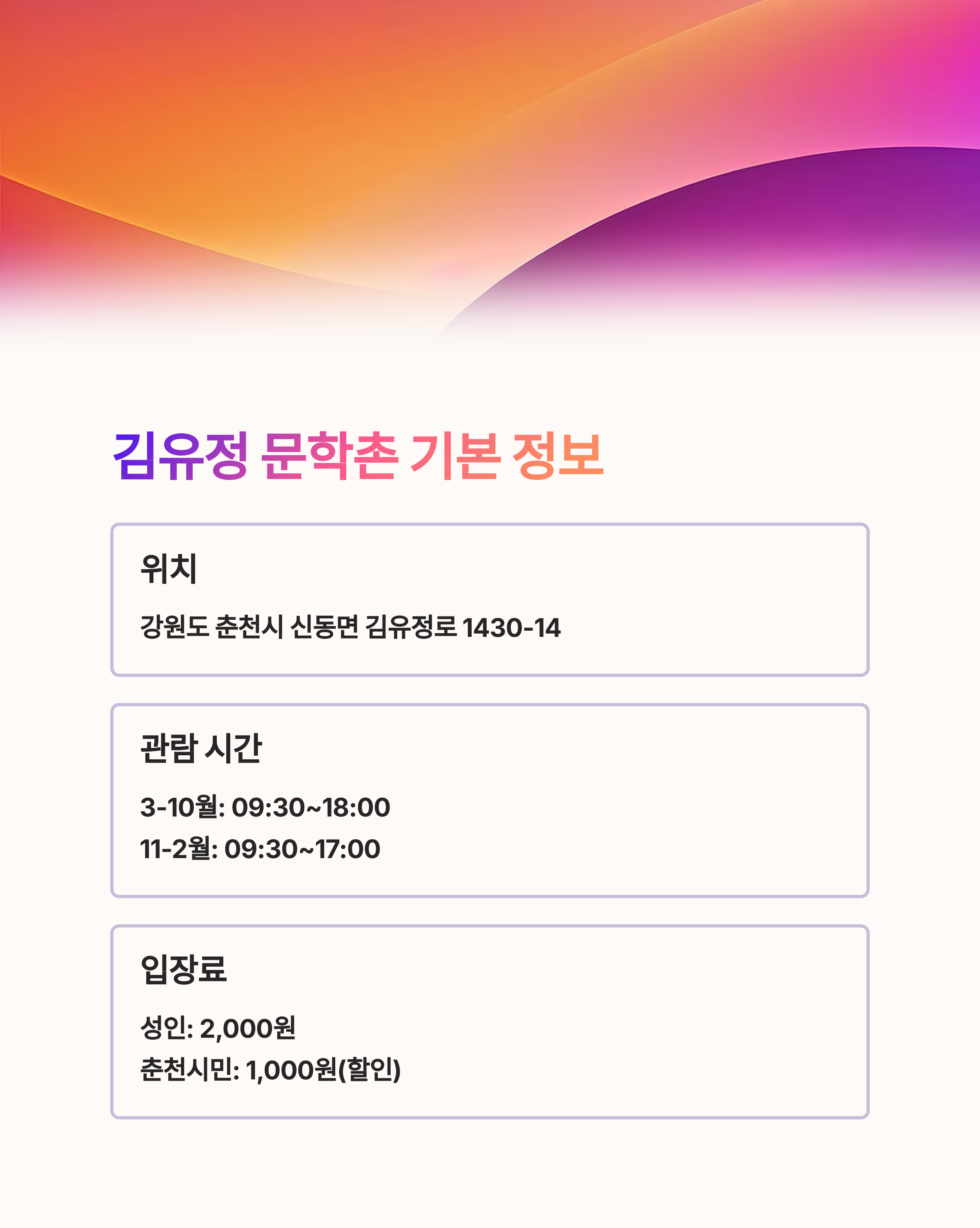 | 입장료 | 성인: 2,000원 춘천시민: 1,000원(할인가) |