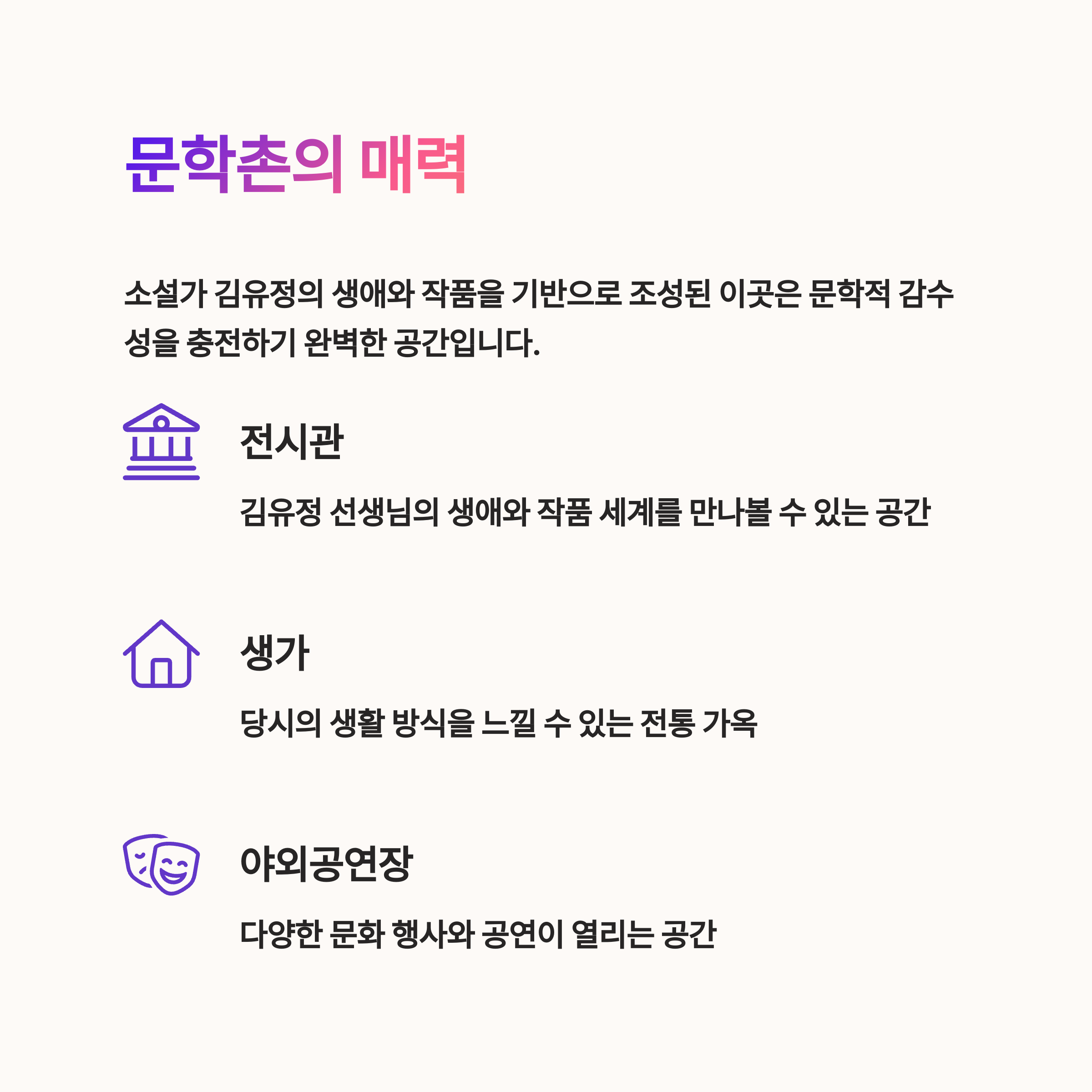 이곳은 특히 가족, 연인, 문학 애호가 모두에게 적합한 공간으로, 방문객 여러분에게 풍성한 문학적 경험을 선사합니다.