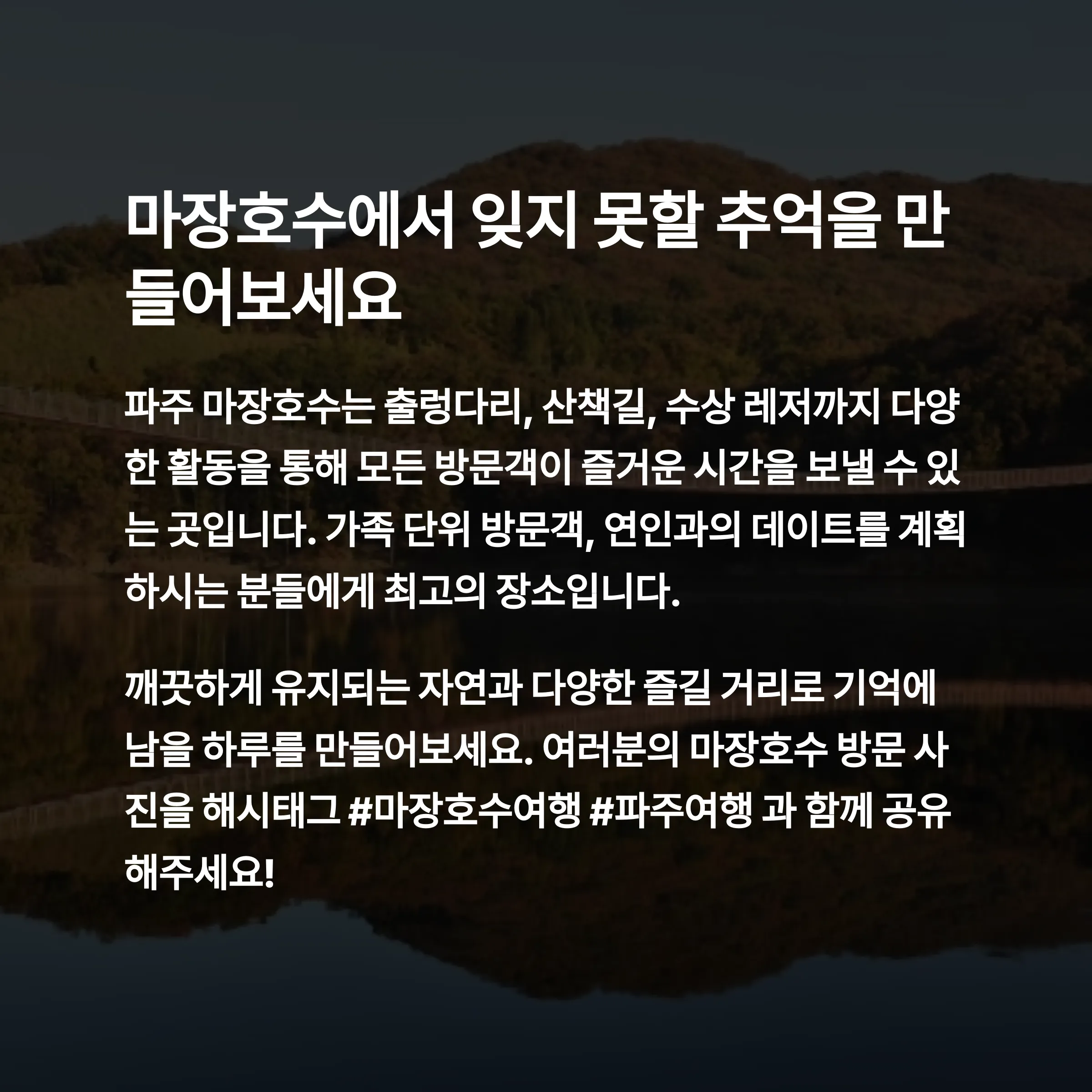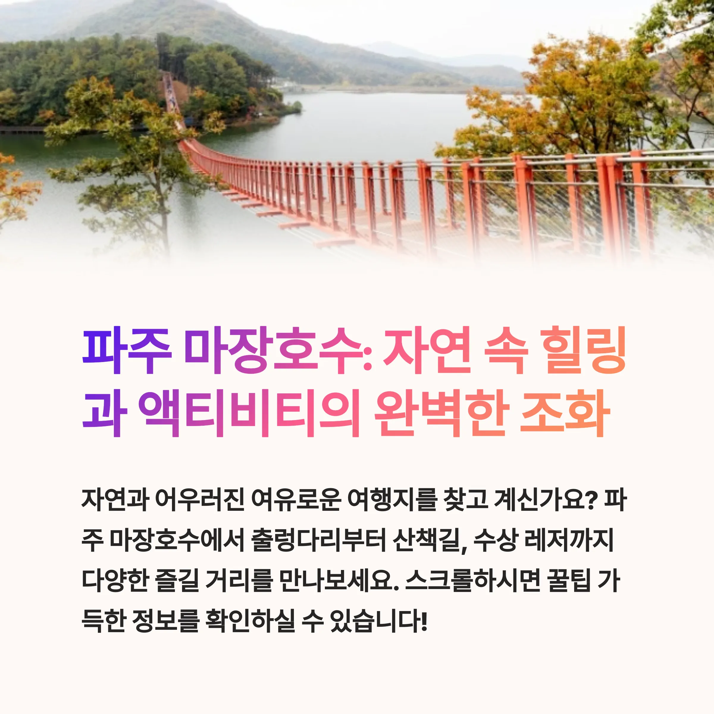 파주 마장호수는 출렁다리, 산책길, 그리고 수상 레저까지 다양한 활동을 통해 모든 방문객이 즐거운 시간을 보낼 수 있는 곳입니다.