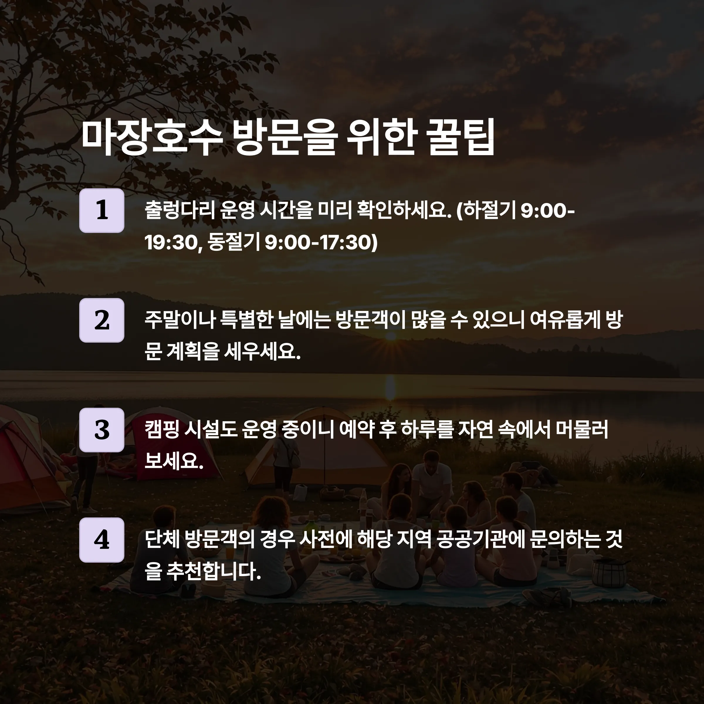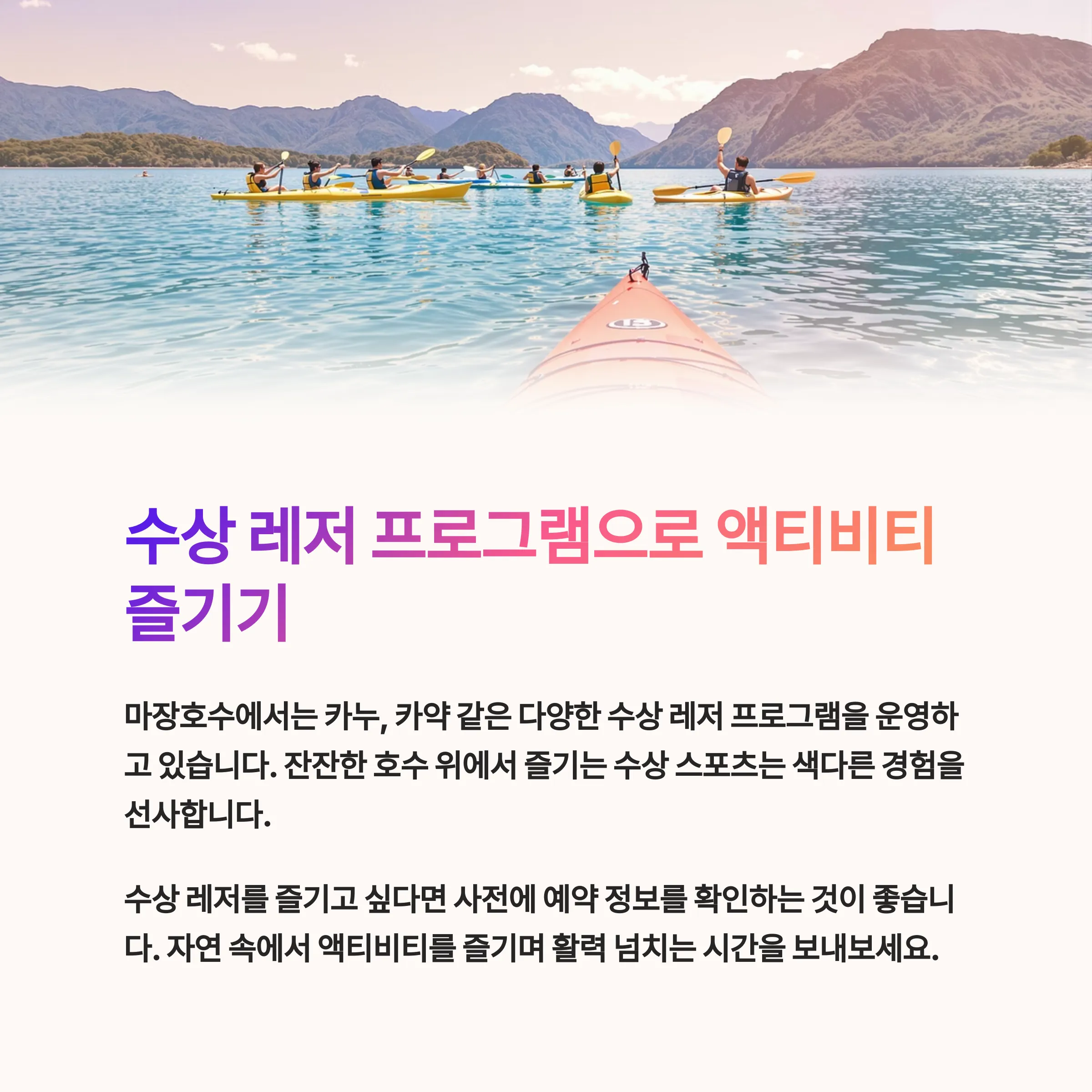 이러한 다양한 매력 덕분에 마장호수는 힐링과 액티비티를 동시에 즐길 수 있는 명소로 주목받고 있습니다.