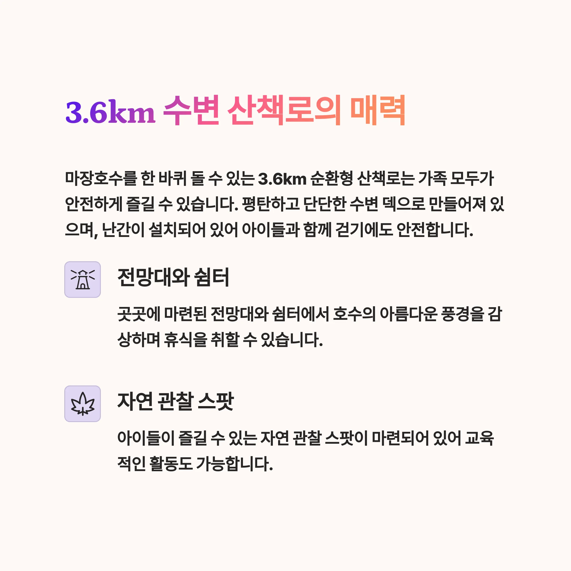 | 산책로는 가족이 함께 걸어도 안전하도록 설계된 순환형 길입니다. 아이들과 함께 걷기에 적합한 평탄하고 단단한 수변 덱으로 만들어져 있으며, 난간이 설치되어 있습니다. 총 길이는 3.6km로 부담 없이 한 바퀴 돌 수 있으며, 곳곳에 쉼터와 전망대가 있어 편안한 시간을 가질 수 있습니다. 아이들이 즐길 수 있는 자연 관찰 스팟도 마련되어 있어, 교육적인 활동을 겸할 수 있습니다. 더불어, 날씨가 좋은 날에는 산책로에서 햇살을 즐기며 도시의 번잡함을 잊을 수 있는 힐링의 기회가 됩니다. |