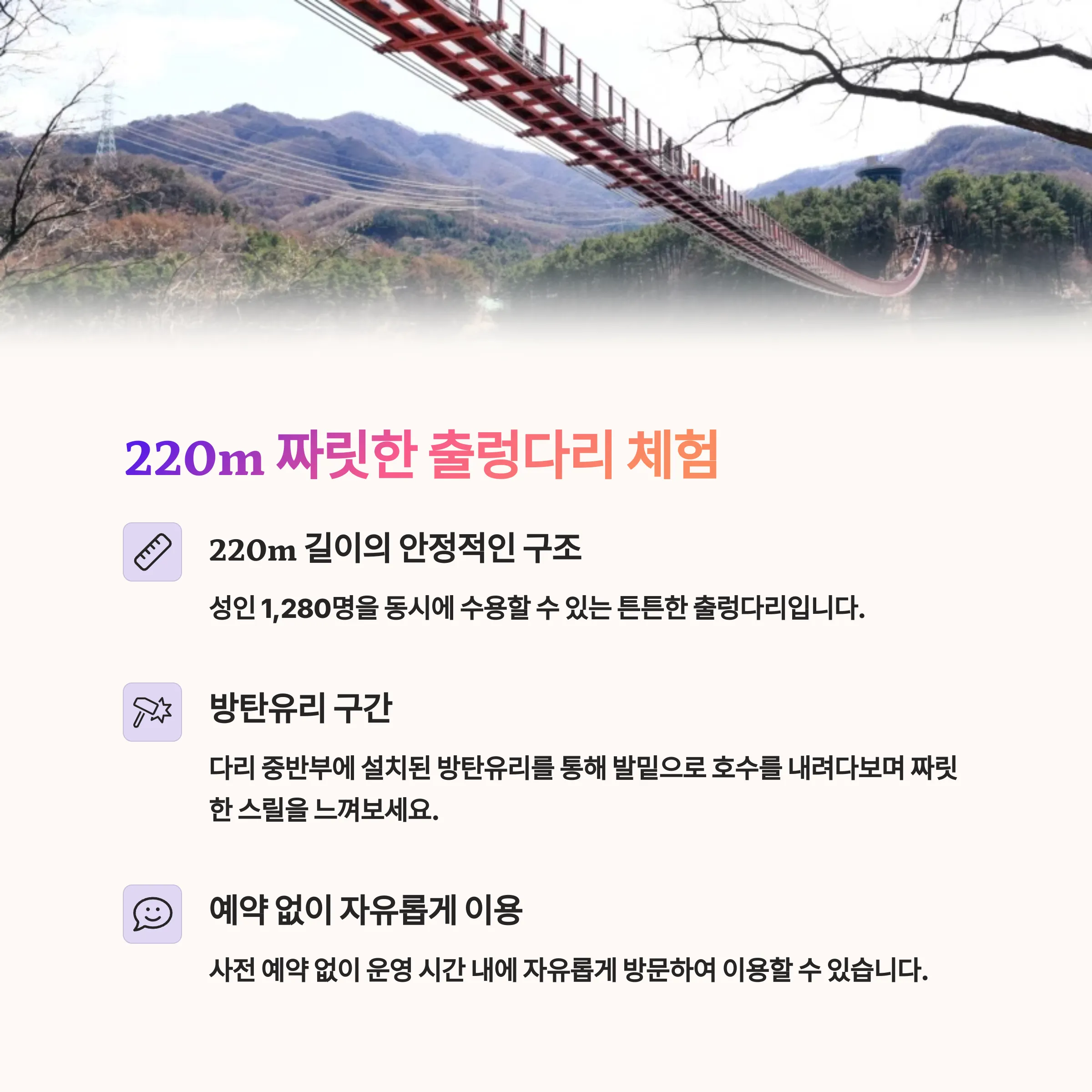 | 출렁다리 운영 시간 | 하절기 9:00~19:30, 동절기 9:00~17:30 |