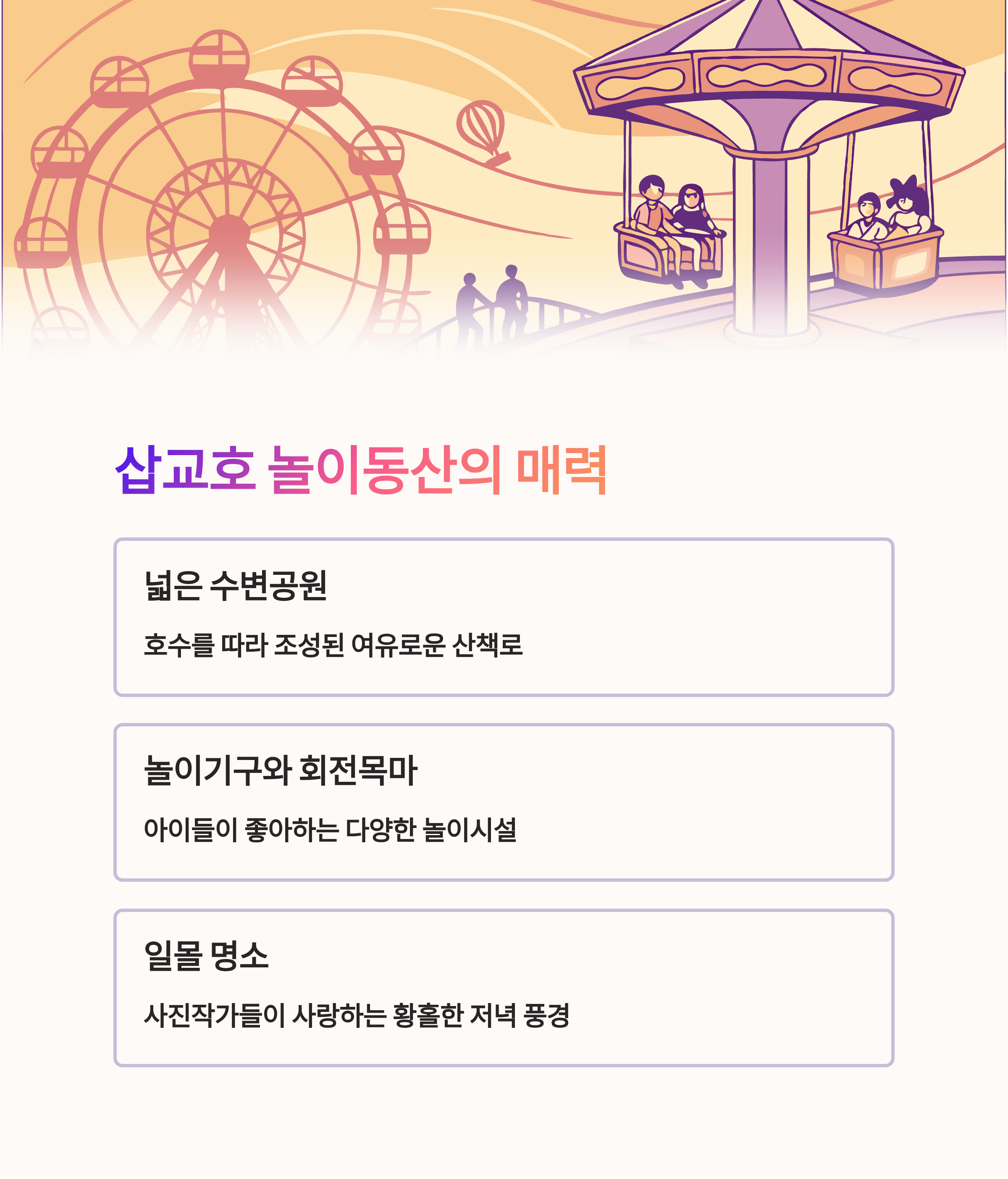 | 삽교호 놀이동산 | 회전목마, 수변공원, 일몰 감상 |