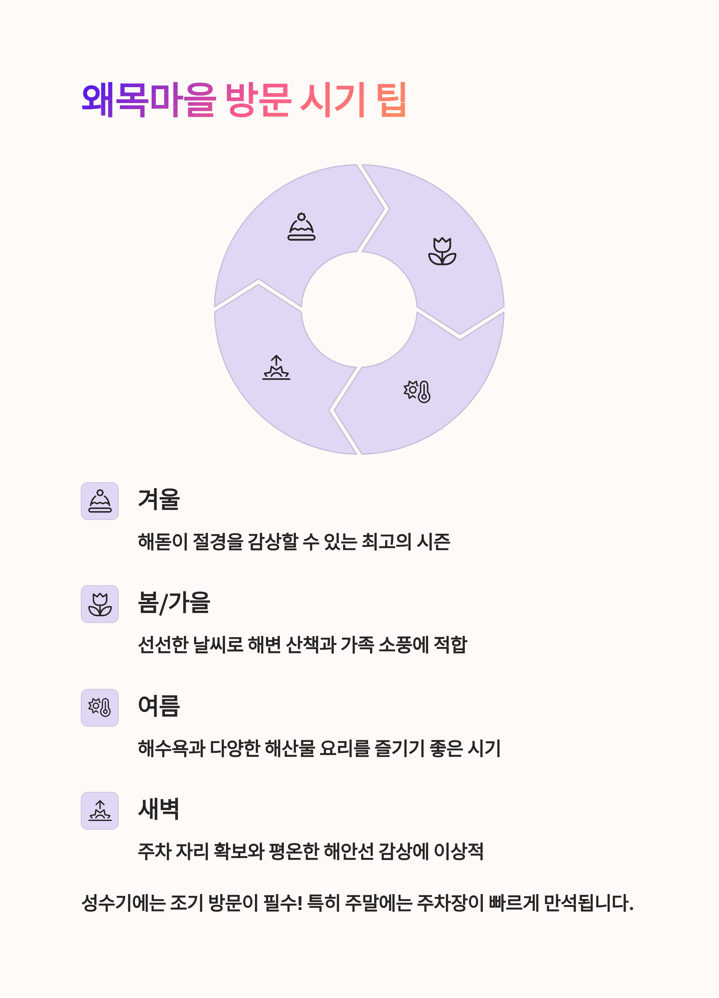 5. 성수기에는 조기 방문이 필수! 특히, 주말에는 왜목마을 주차장이 빠르게 만석이 될 수 있습니다.