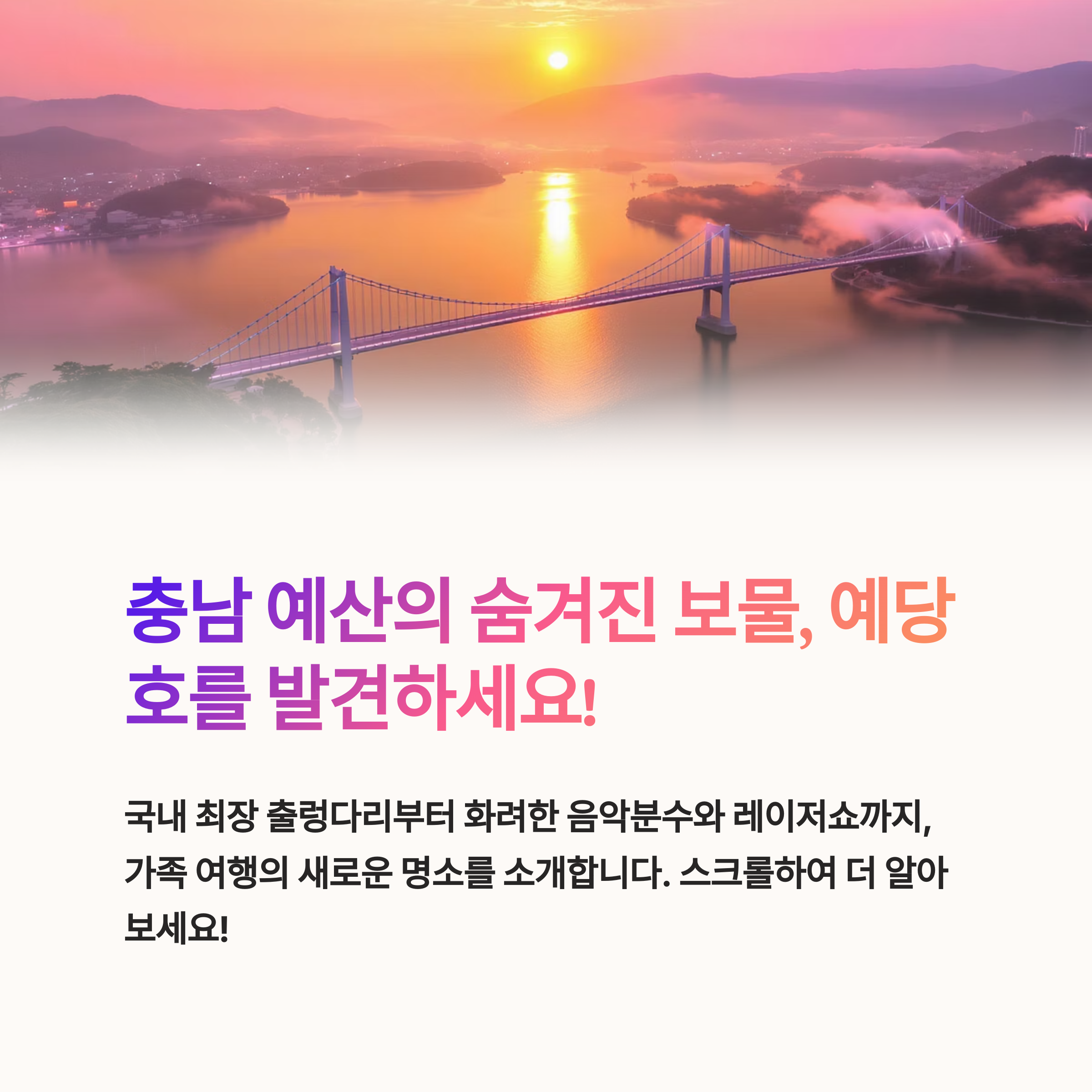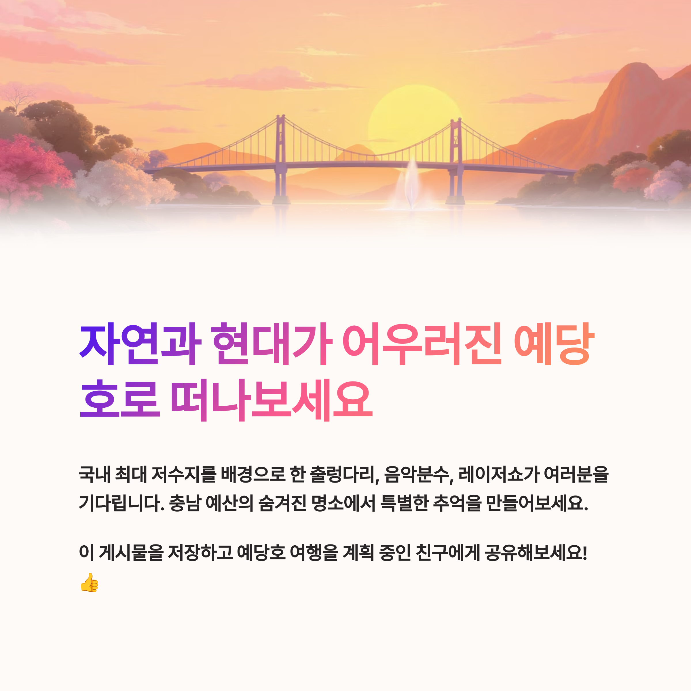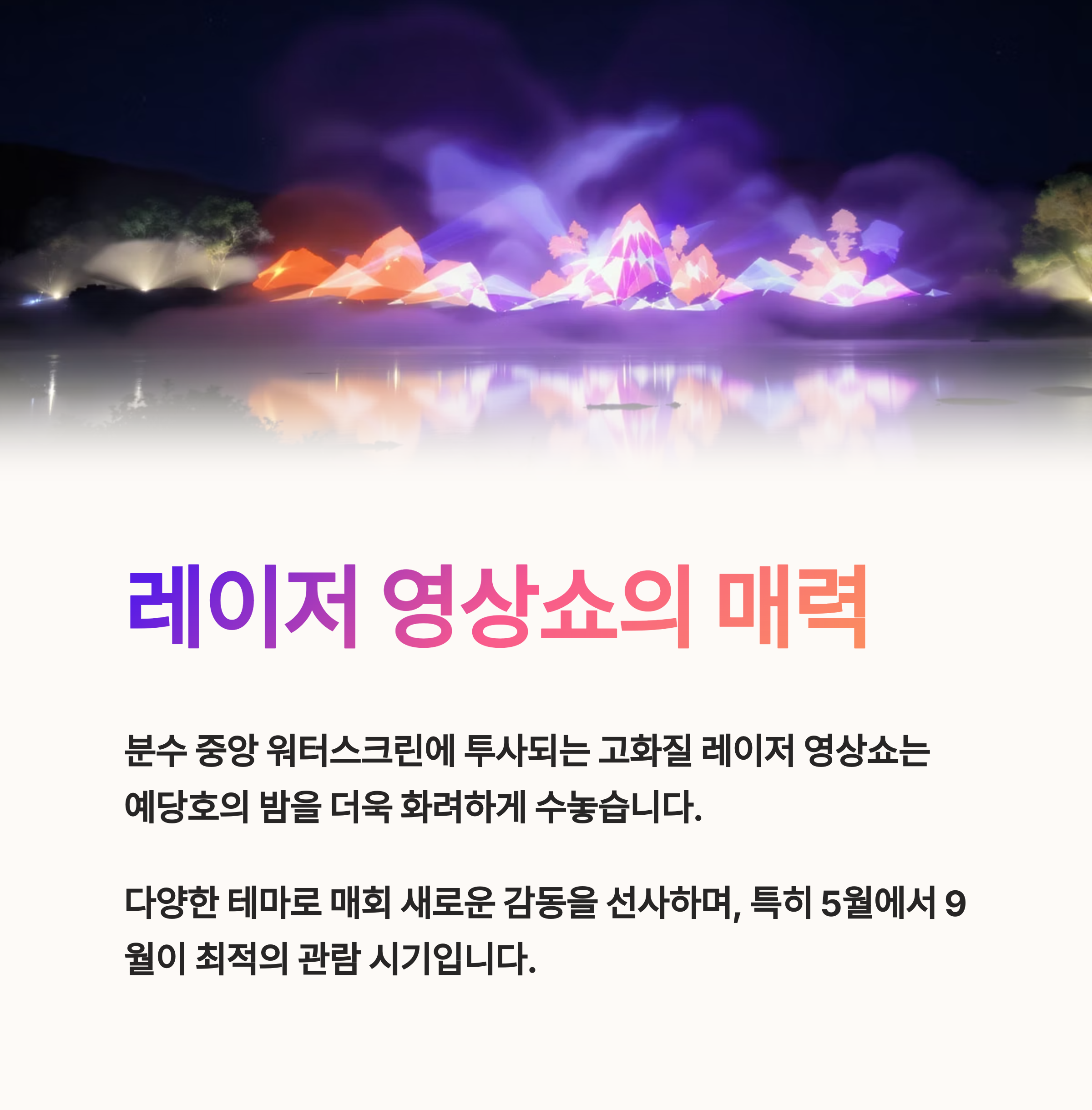 오늘은 예당호의 출렁다리, 음악분수, 그리고 매력적인 레이저 영상쇼에 관한 유익한 정보를 공유하겠습니다.
