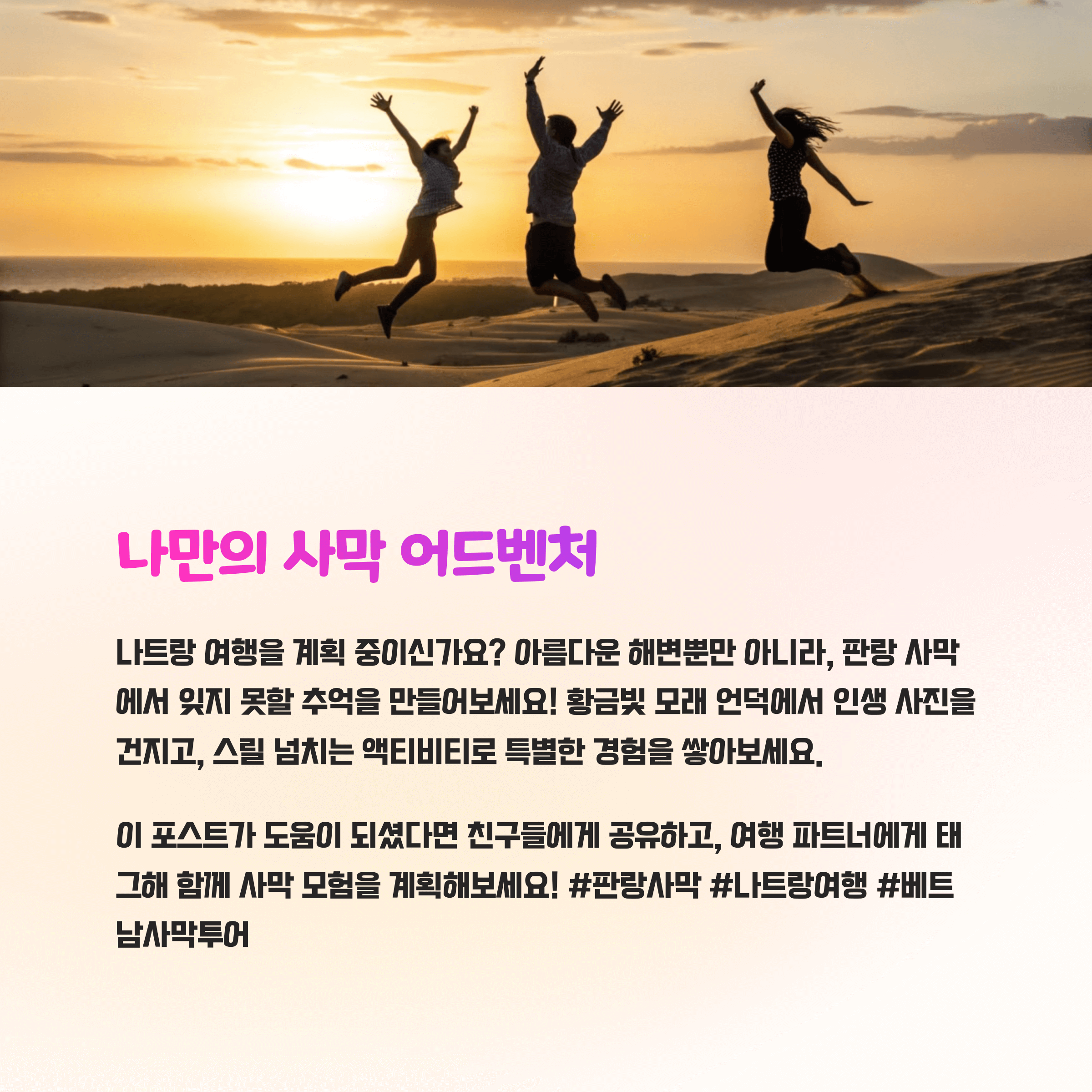 판랑 사막 투어는 이동 시간이 짧고 다양한 액티비티를 제공해 나트랑 방문객에게 인기가 높습니다.