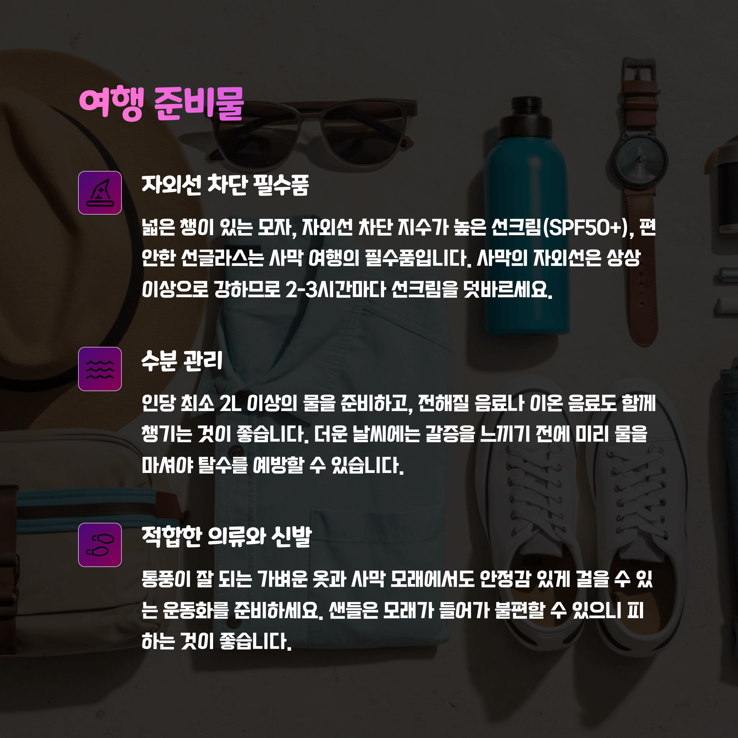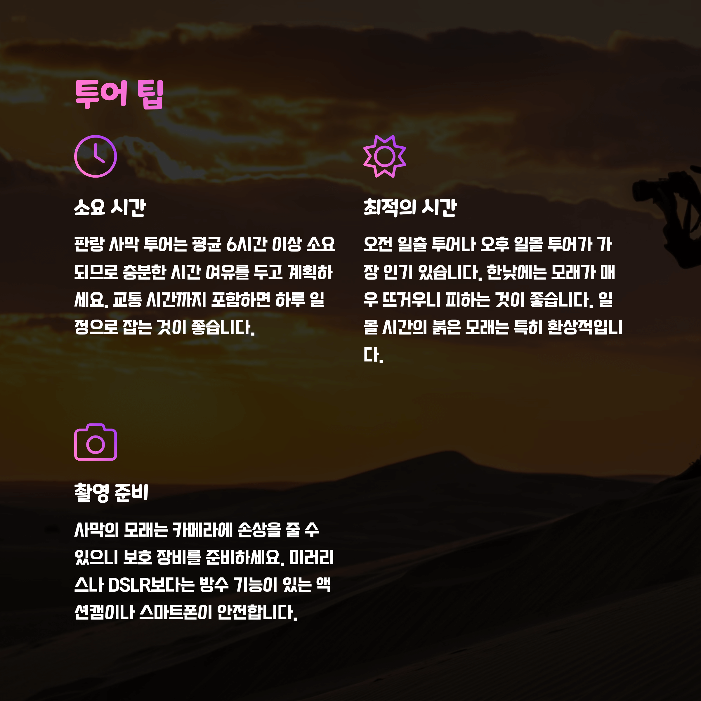 | Q. 판랑 사막 투어 시 어떤 준비물이 필요할까요? |