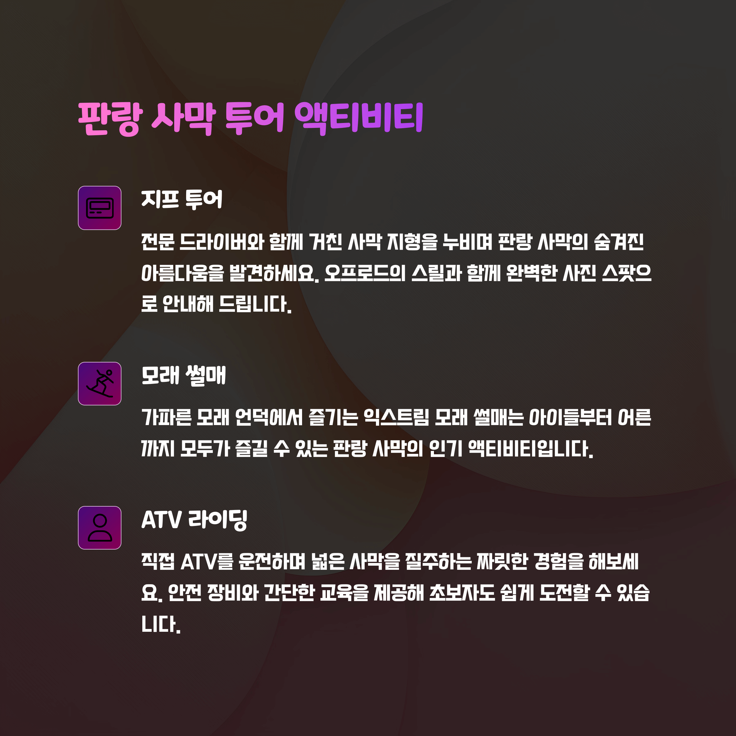 모래 썰매, 지프 투어 등 활동은 모든 연령대에게 즐거움을 주며 사진 촬영 명소로도 손색이 없습니다.