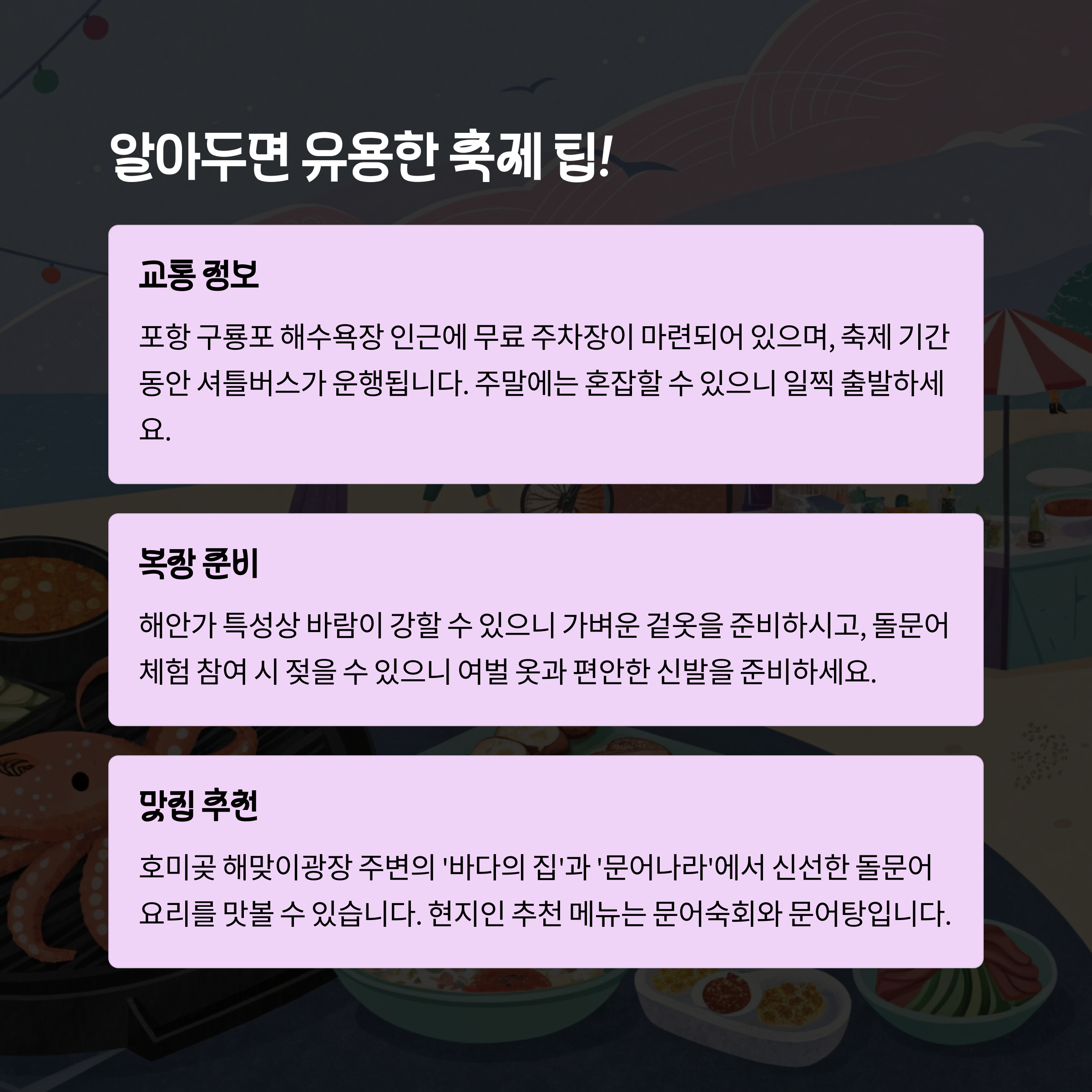 이번 축제는 먹거리와 볼거리가 잘 어우러진 포항만의 매력을 한껏 느낄 수 있는 시간이 될 것입니다.