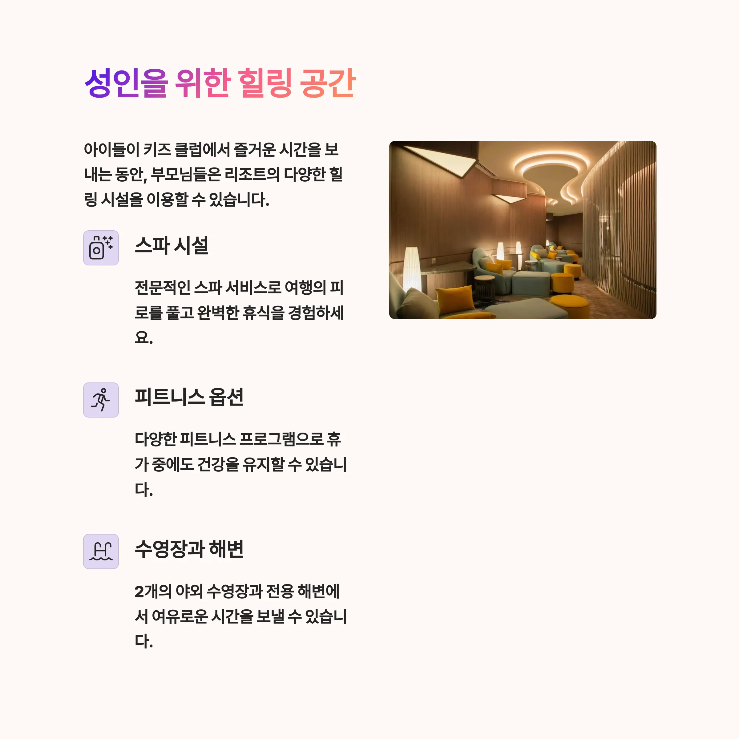 또한 스파 시설과 다양한 피트니스 옵션은 성인 고객들의 힐링을 위한 완벽한 선택지라 할 수 있습니다.