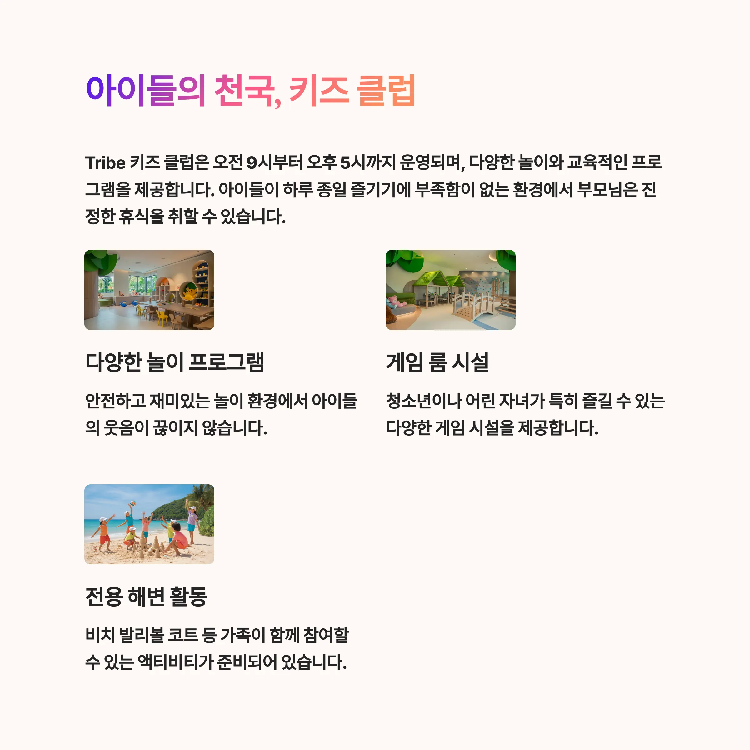 | 아이를 데리고 볼거리를 찾는 가족에게 이곳은 최고의 선택지입니다. Tribe 키즈 클럽은 다양한 놀이와 교육적인 프로그램을 제공하며, 이는 아이들이 하루 종일 즐기기 부족함이 없습니다. 전용 해변과 비치 발리볼 코트는 어린이부터 부모님까지 모두 참여할 수 있어 가족 간 더 많은 추억을 쌓을 수 있습니다. 이외에도 게임 룸 시설은 청소년이나 어린 자녀가 특히 즐길 수 있는 주요 특징 중 하나입니다. 마지막으로 매일 아침 제공되는 무료 조식은 아이들의 편식 문제도 해결해주는 다양한 음식 메뉴로 구성되어 있습니다. |
