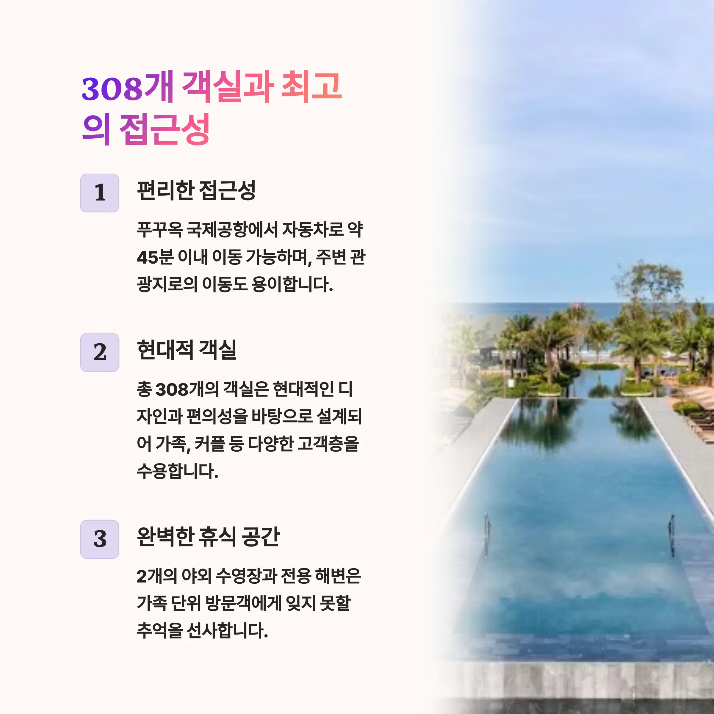 특히 가족들이 함께 즐기기에 완벽하게 설계된 해변과 놀이 시설은 차별화된 경험을 보장하죠.