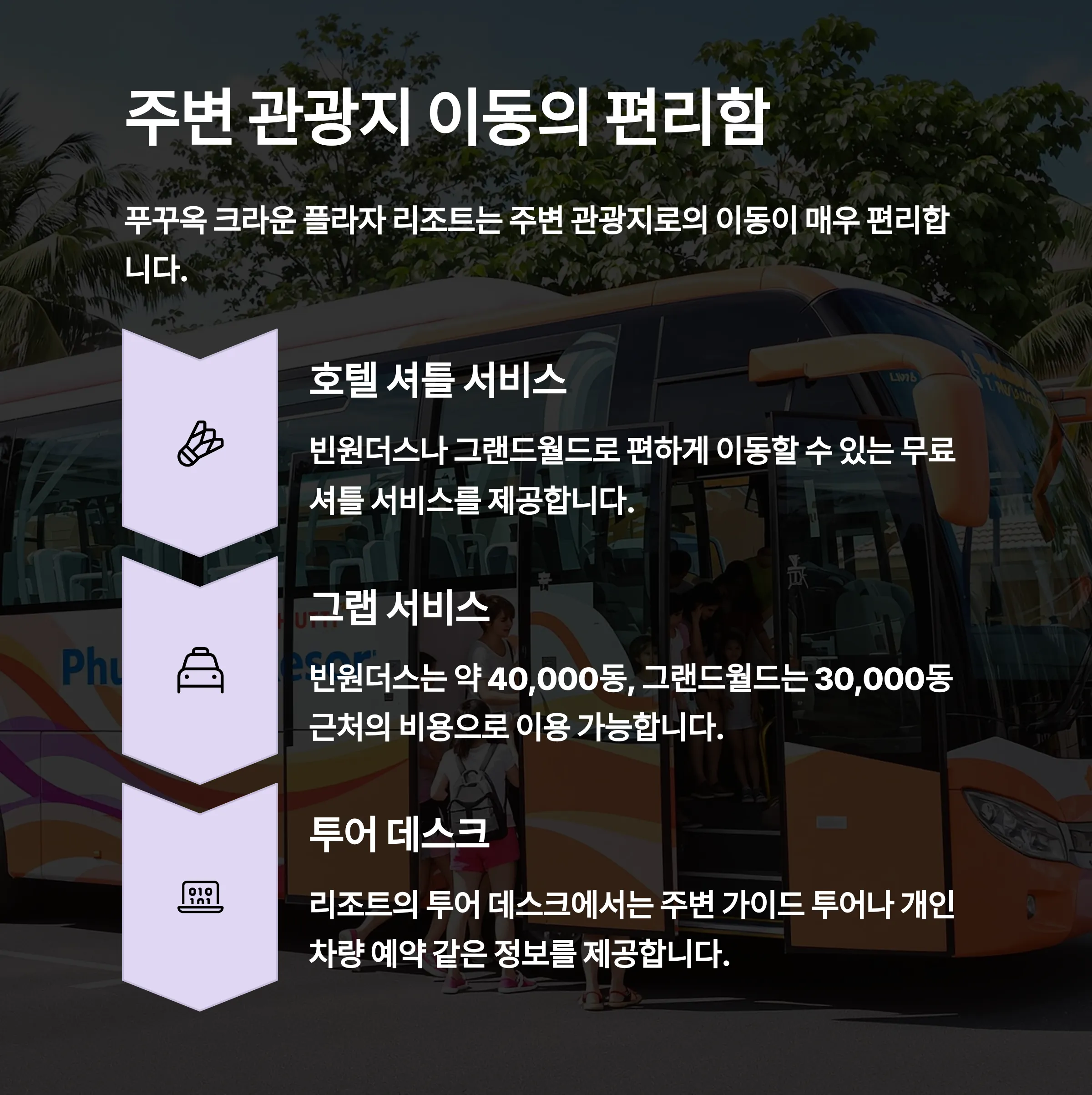 | 리조트에서 쉽게 이동 가능한 가장 큰 장점 중 하나가 셔틀 서비스입니다. 호텔 셔틀 서비스를 이용하면 빈원더스나 그랜드월드로 편하게 이동할 수 있습니다. 그랩 서비스를 이용할 경우, 빈원더스는 약 40,000동, 그랜드월드는 30,000동 근처의 비용으로 이용 가능합니다. 여행 중에 근처 환경을 더 즐기고 싶다면, 자전거나 도보 옵션도 고려해 볼 수 있습니다. 마지막으로 리조트의 투어 데스크에서는 주변 가이드 투어나 개인 차량 예약 같은 정보도 제공합니다. |