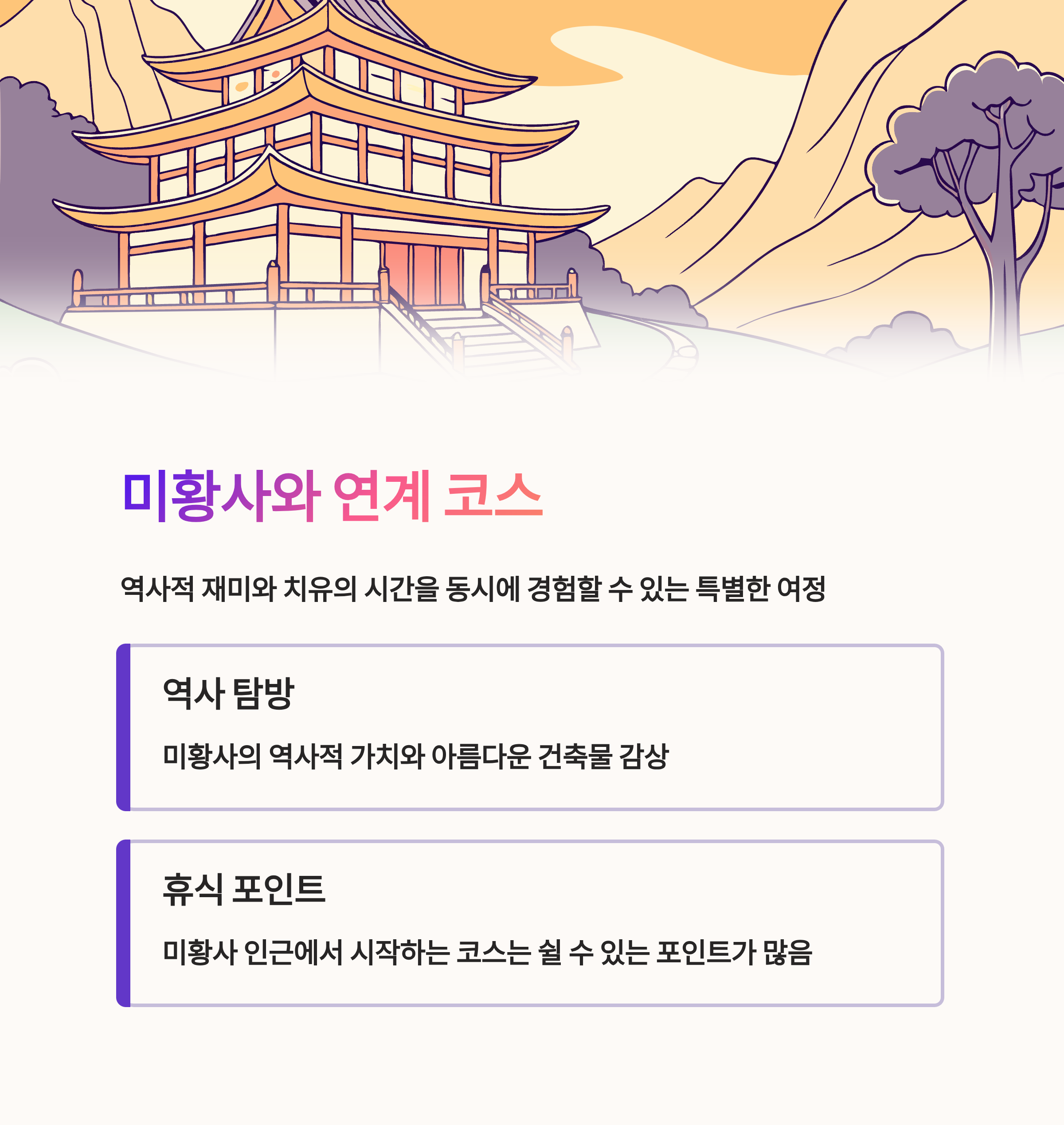 방문객들에게 미황사와의 연결 코스를통한 역사적 재미와 치유의 시간을 선사합니다.