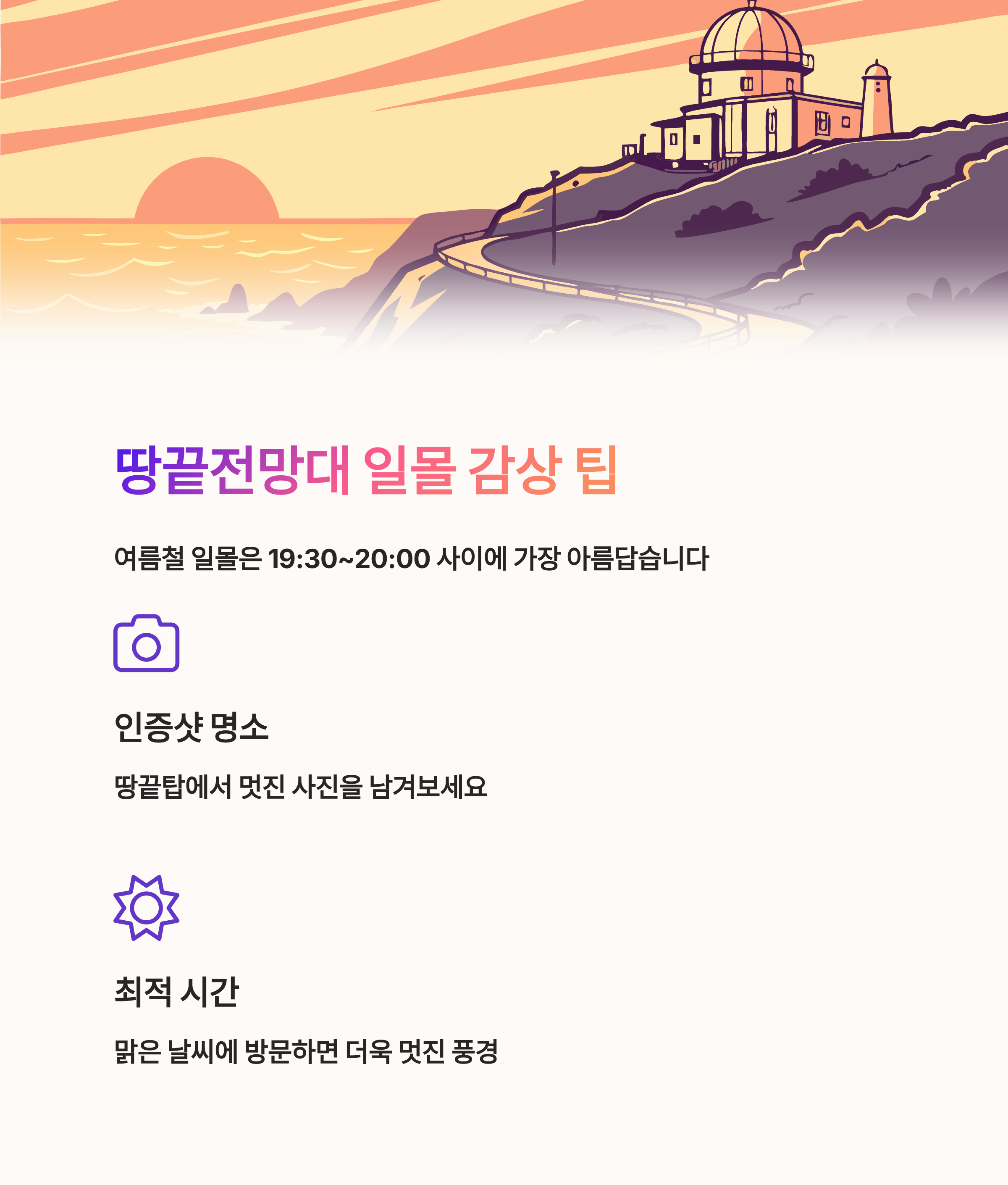 | Q. 땅끝전망대에서 일몰을 감상하기 좋은 시간은 언제인가요? |