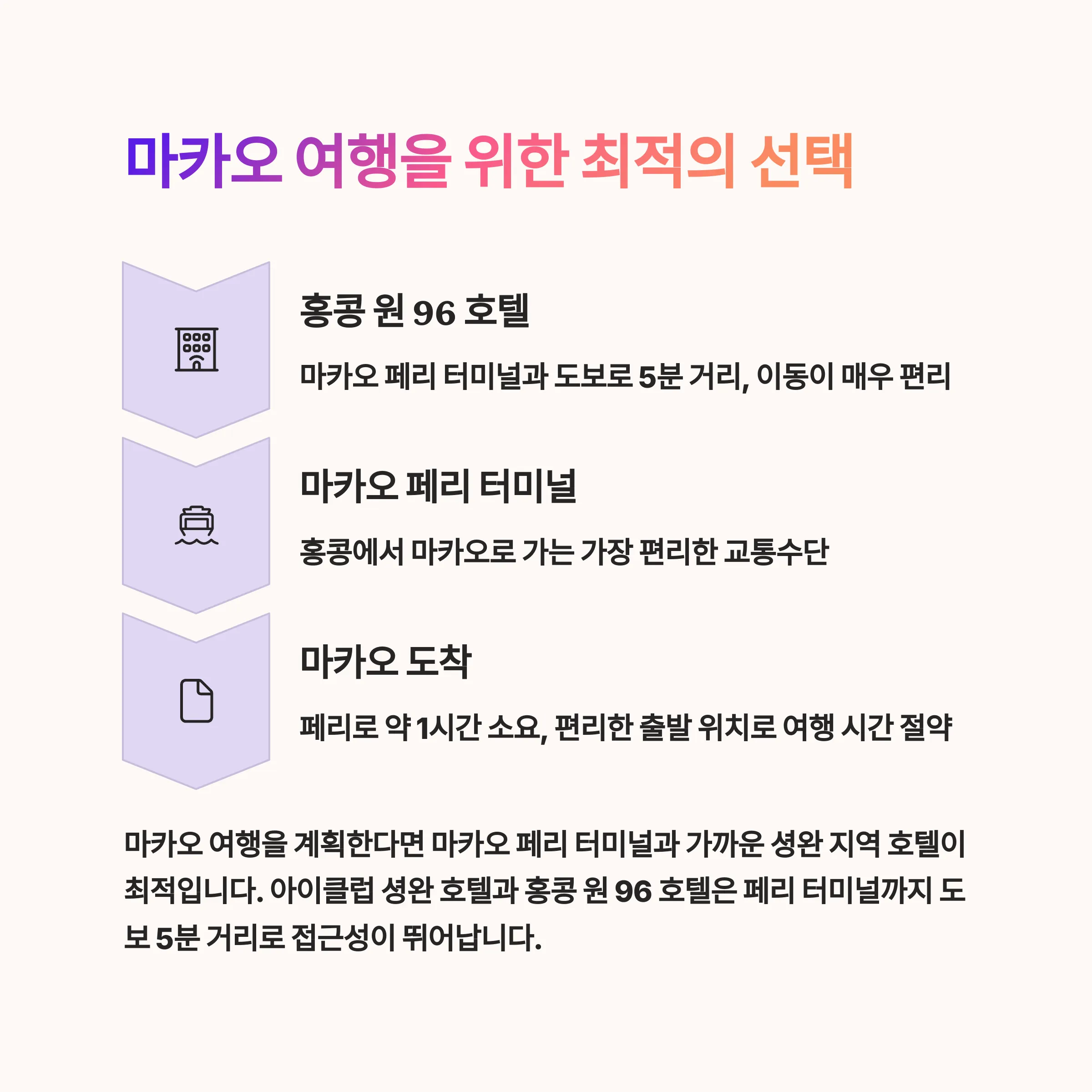 추가적으로 마카오 여행 계획이 있다면, 마카오 페리 터미널과 가까운 홍콩 원 96 호텔을 눈여겨보세요.