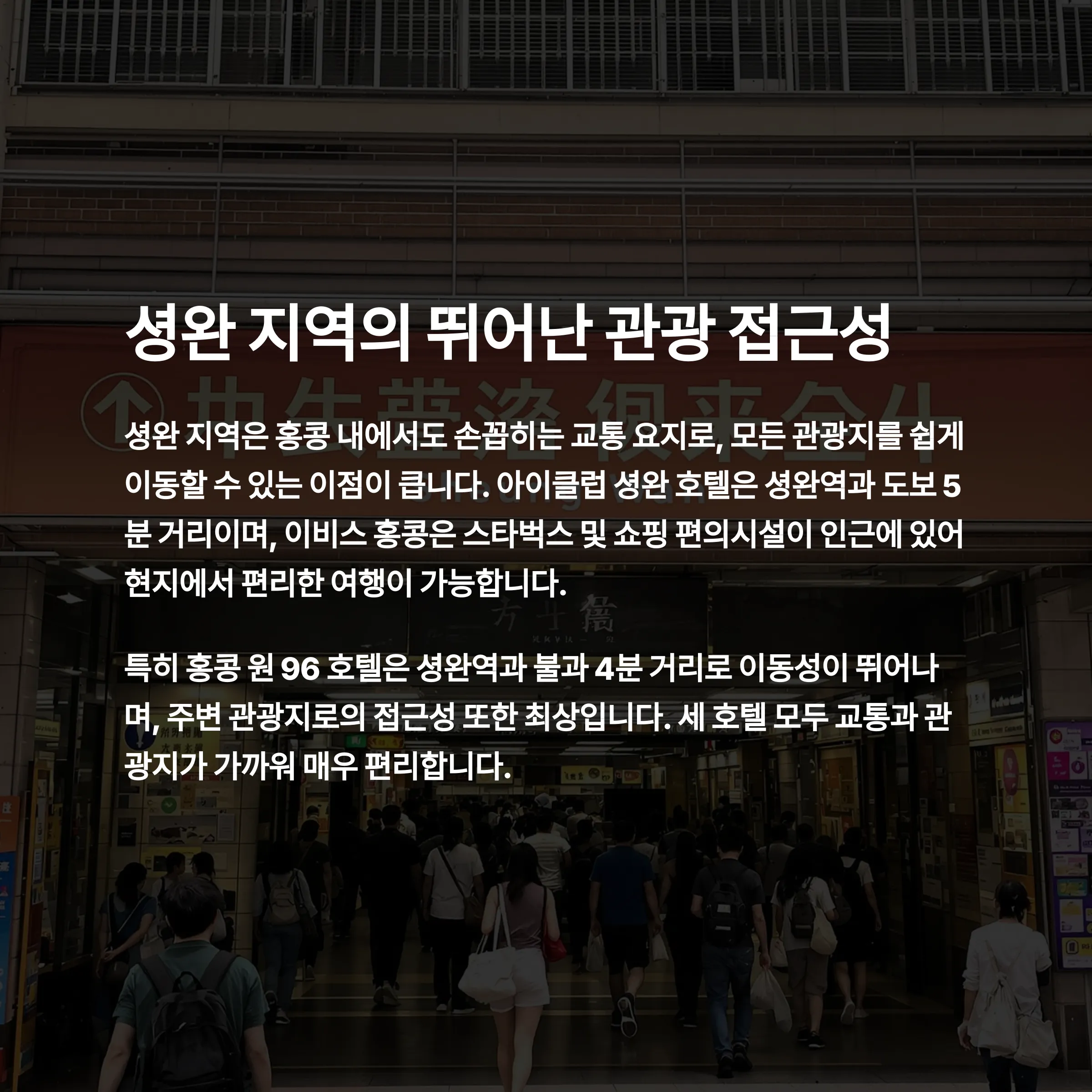특히 교통 중심지인 셩완역 주변에 위치하여, 관광과 비즈니스 모두에 강점을 제공합니다.