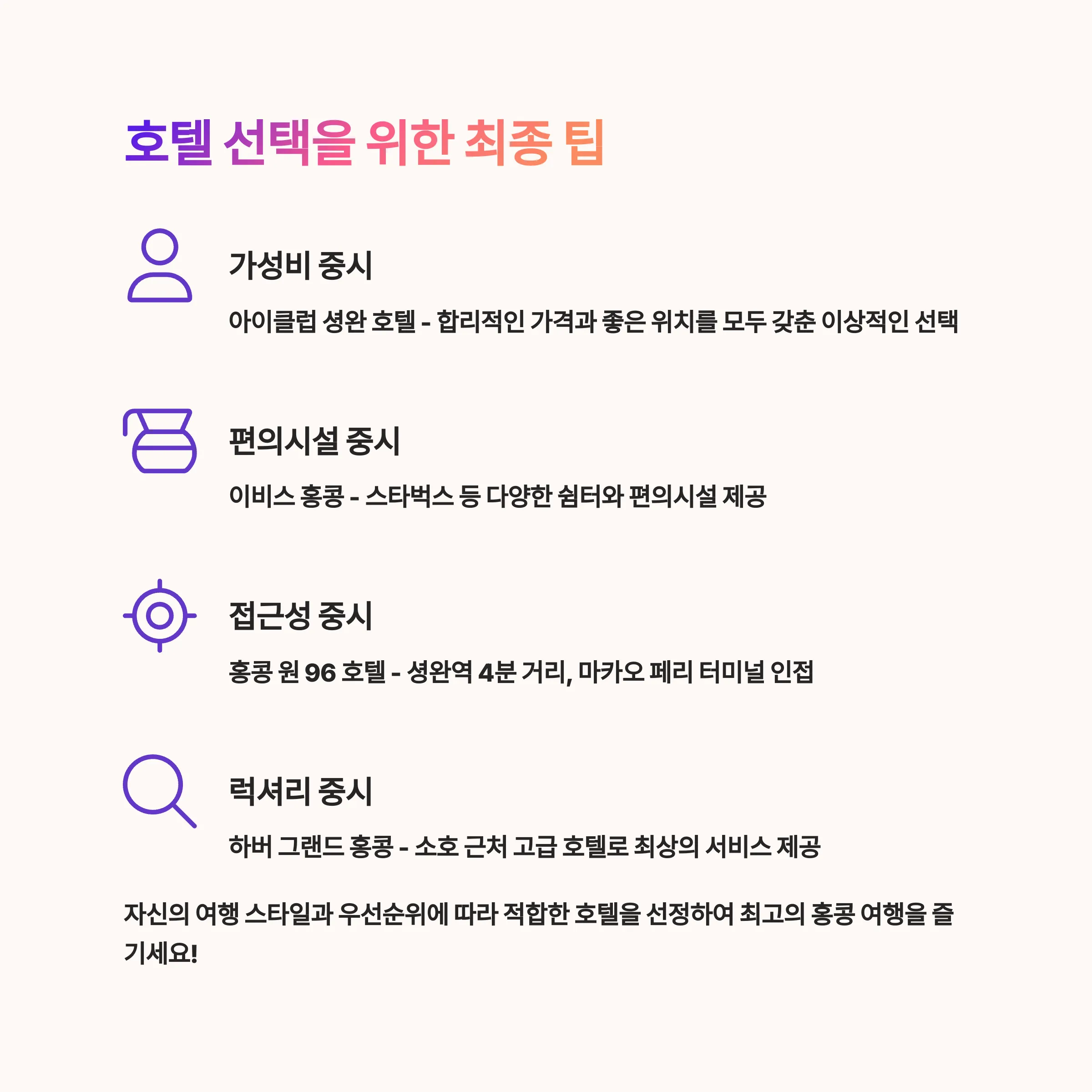 따라서 자신의 여행 스타일에 따라 적합한 호텔을 선정하셔서 최고의 홍콩 여행을 즐기시길 바랍니다!