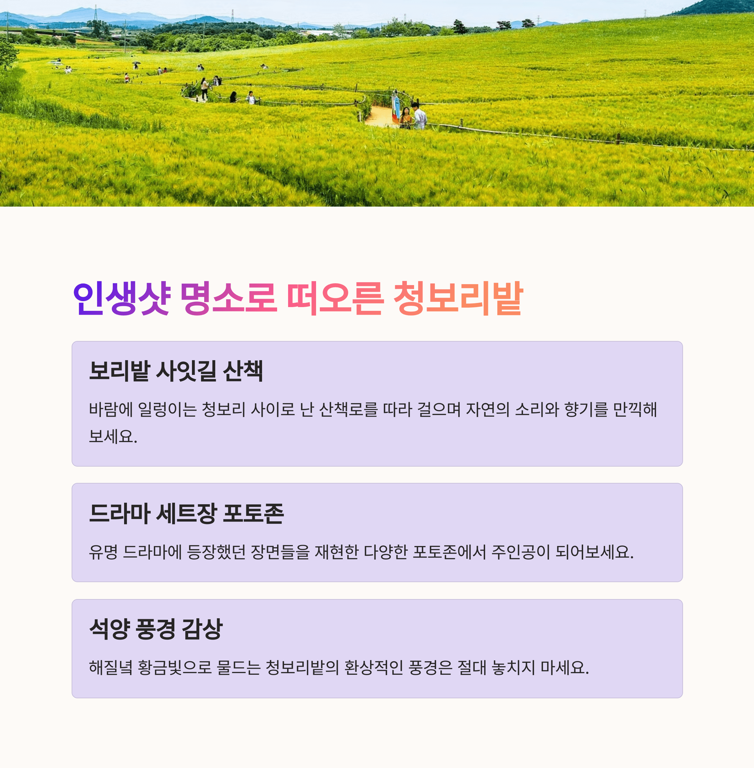 적합한 시기를 선택하여 보리밭의 최상의 아름다움을 경험하시길 추천합니다.