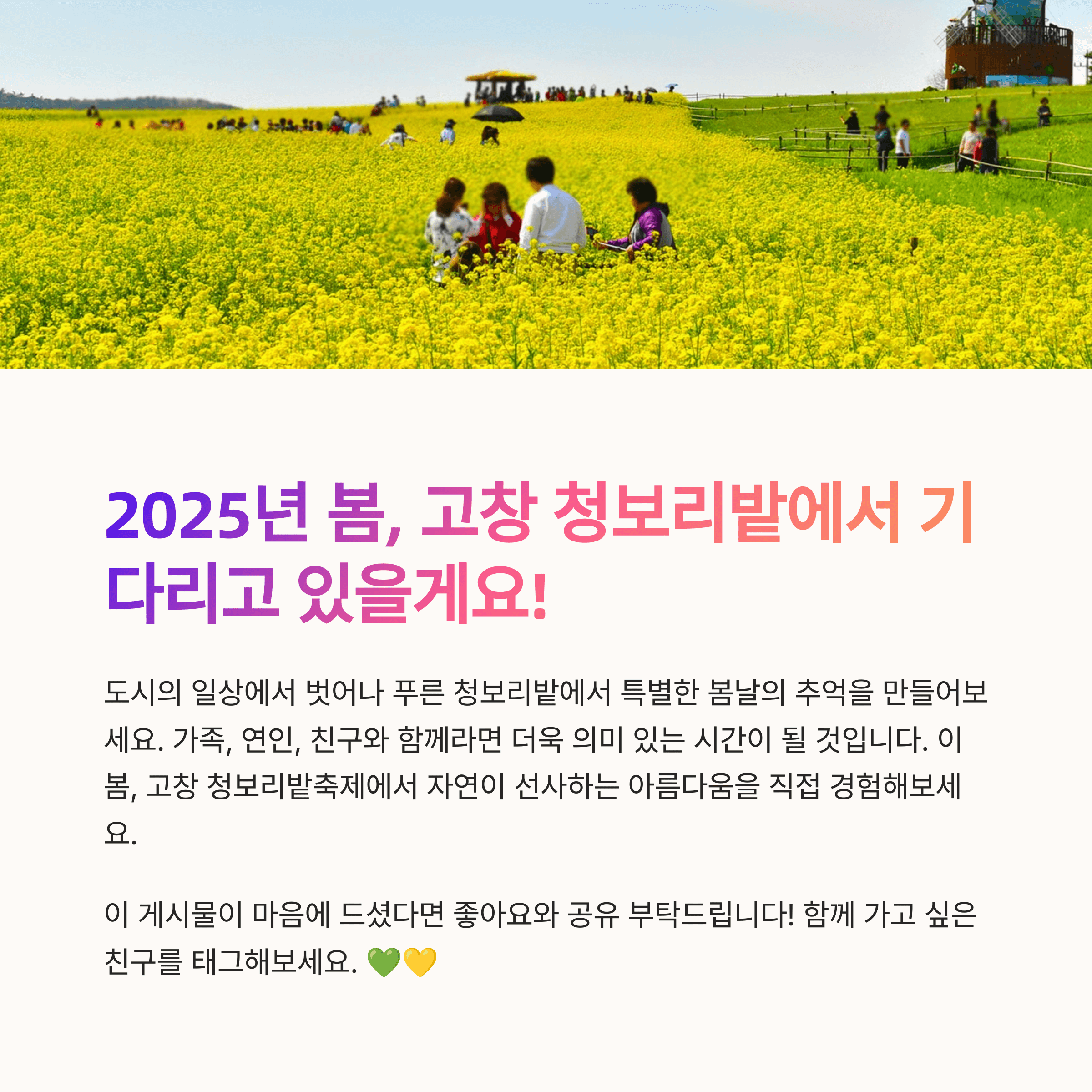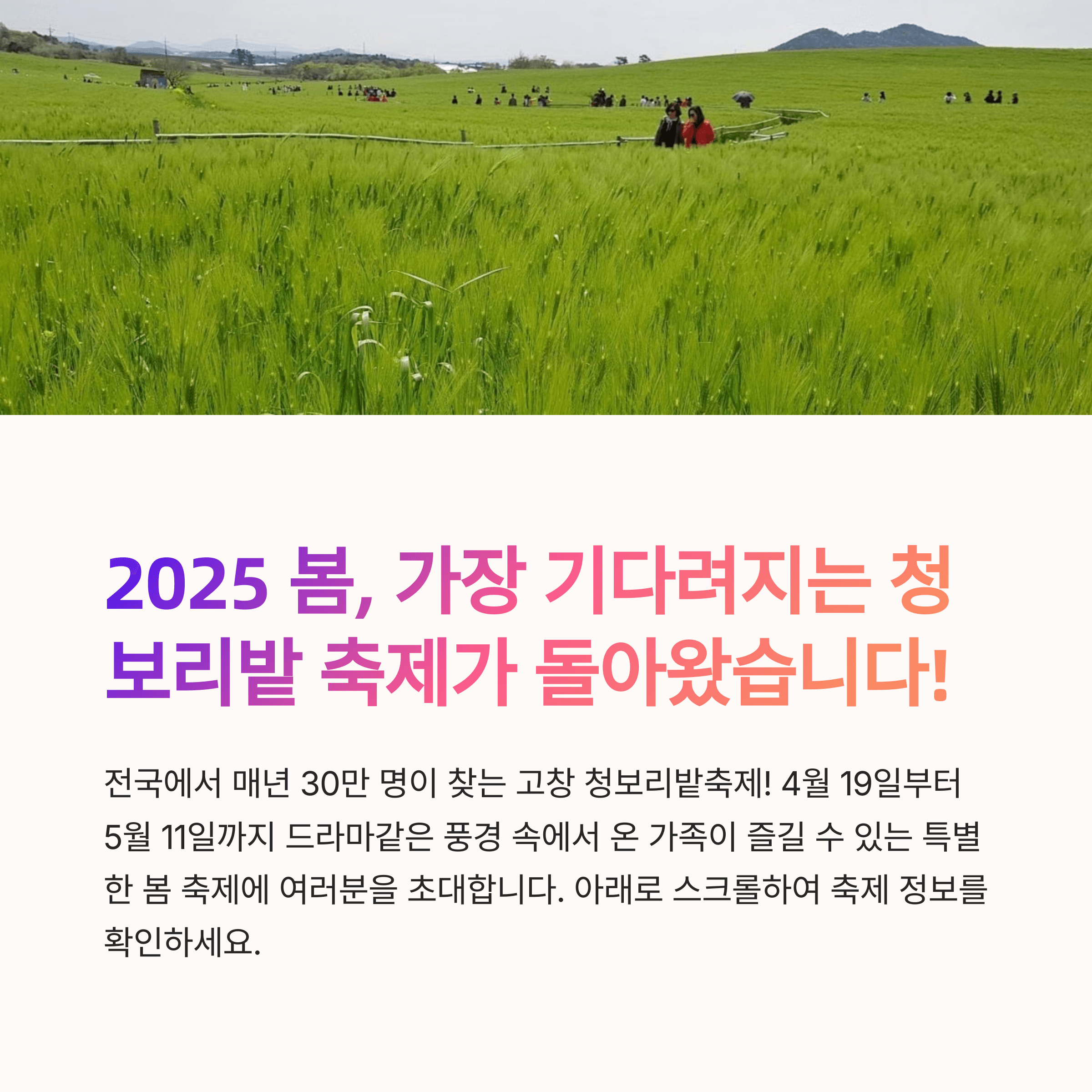 2025 고창 청보리밭축제는 다양한 프로그램과 자연경관이 어우러진 훌륭한 축제입니다.