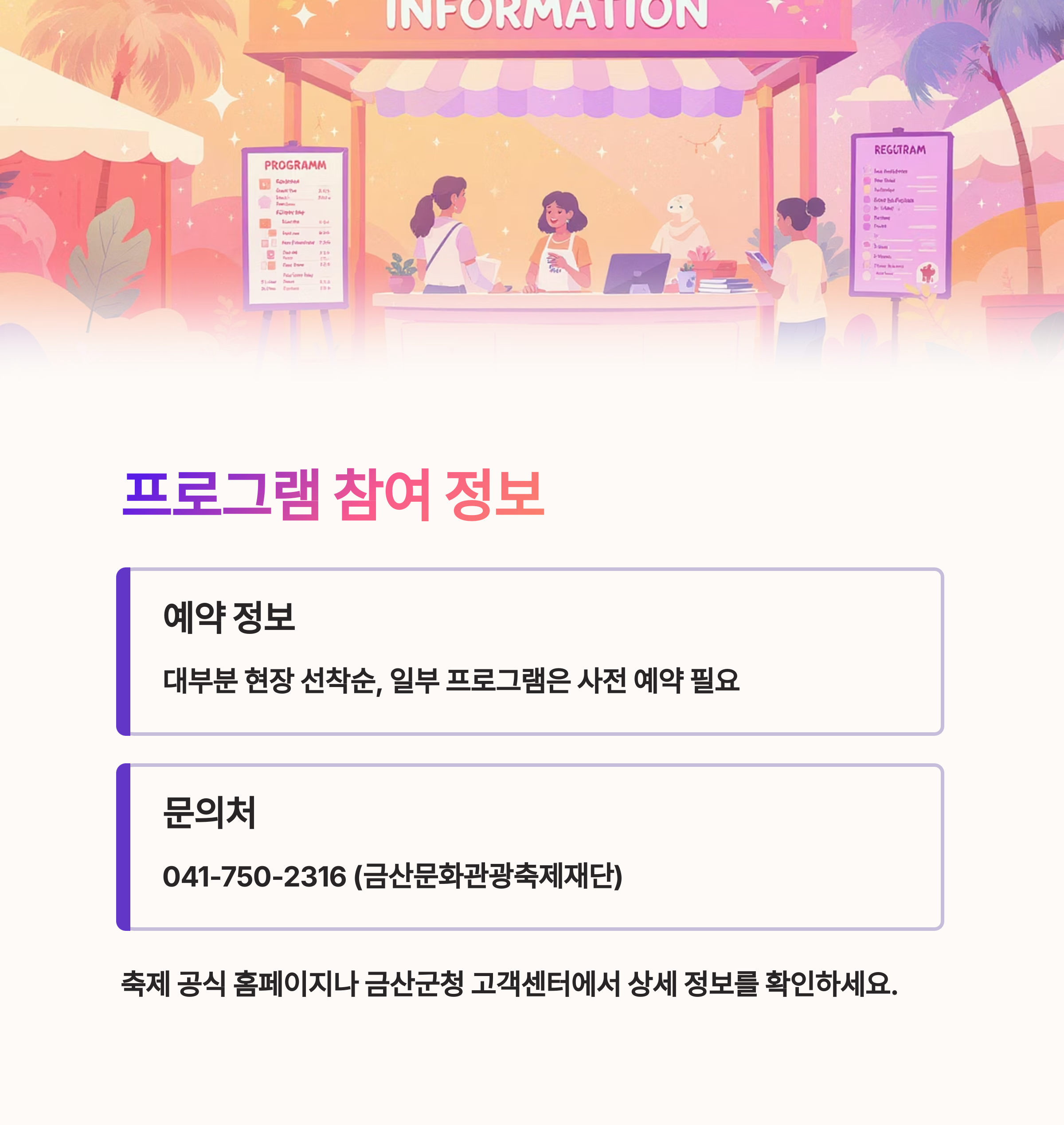 | Q. 축제 프로그램의 예약제 운영 여부를 어디어디 확인할 수 있을까요? |