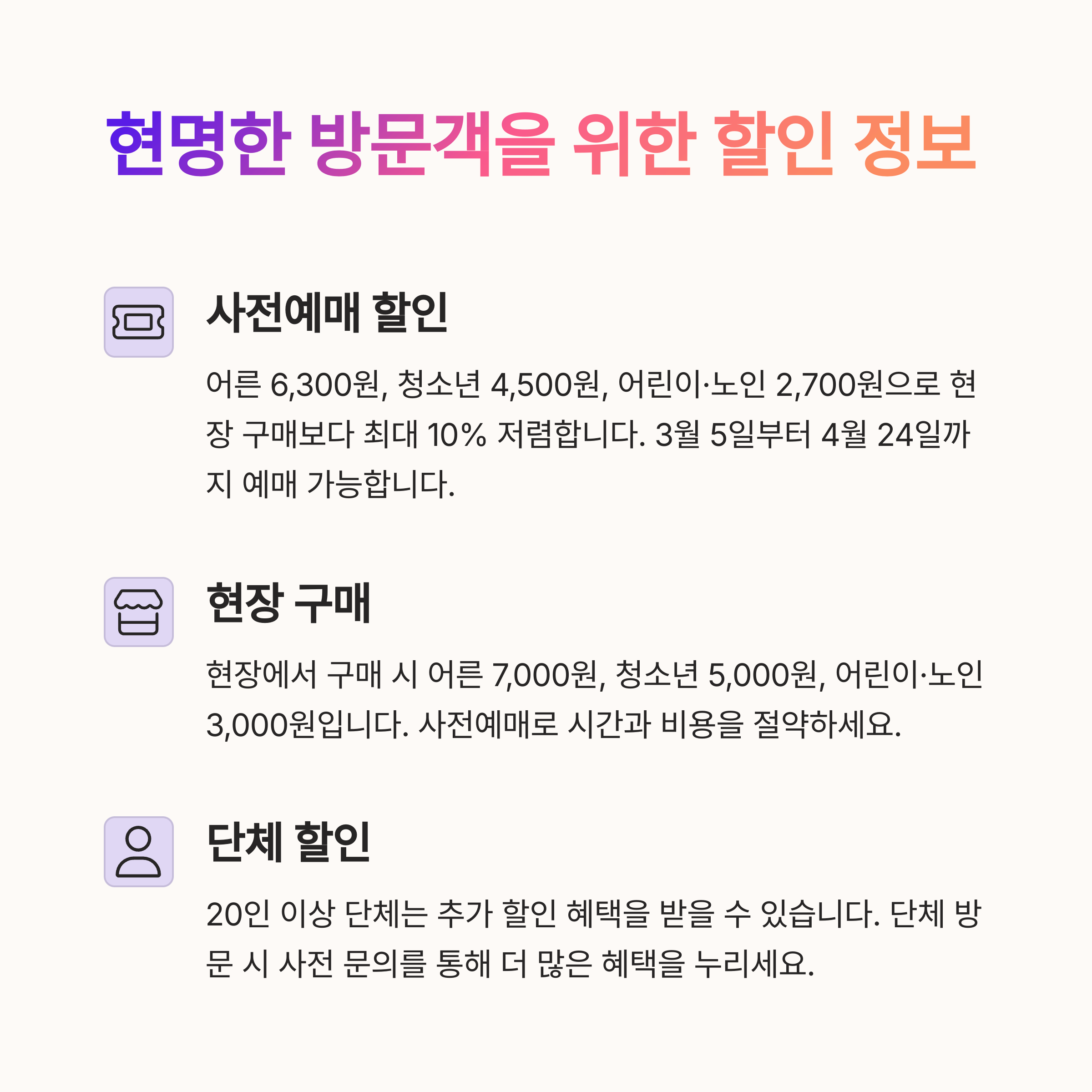 | 사전예매 입장료 | 어른 6,300원, 어린이·경로 2,700원 |