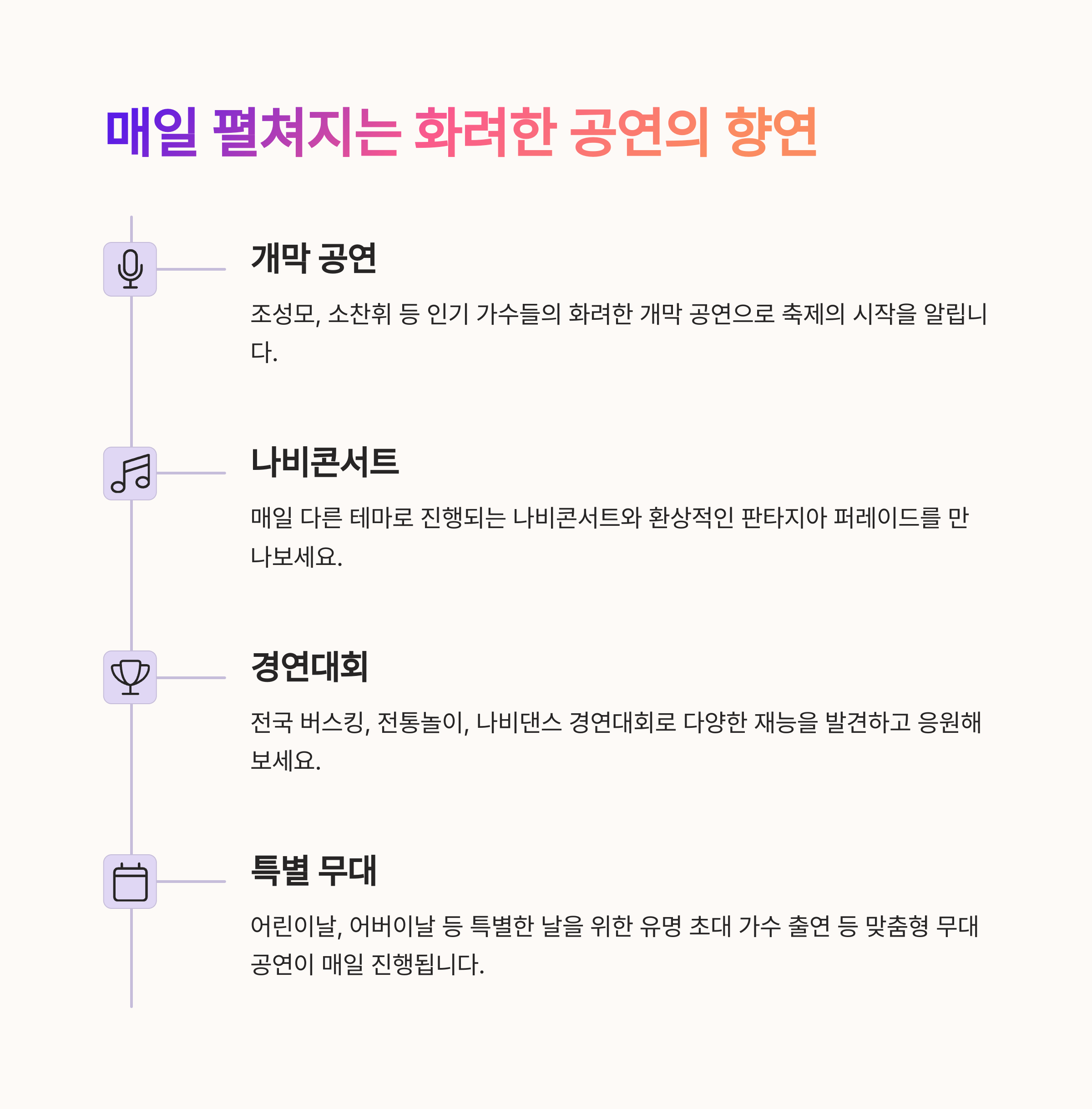 2. 주요 이벤트로 나비 콘서트, 퍼레이드, 전통놀이 등이 준비되어 있습니다.