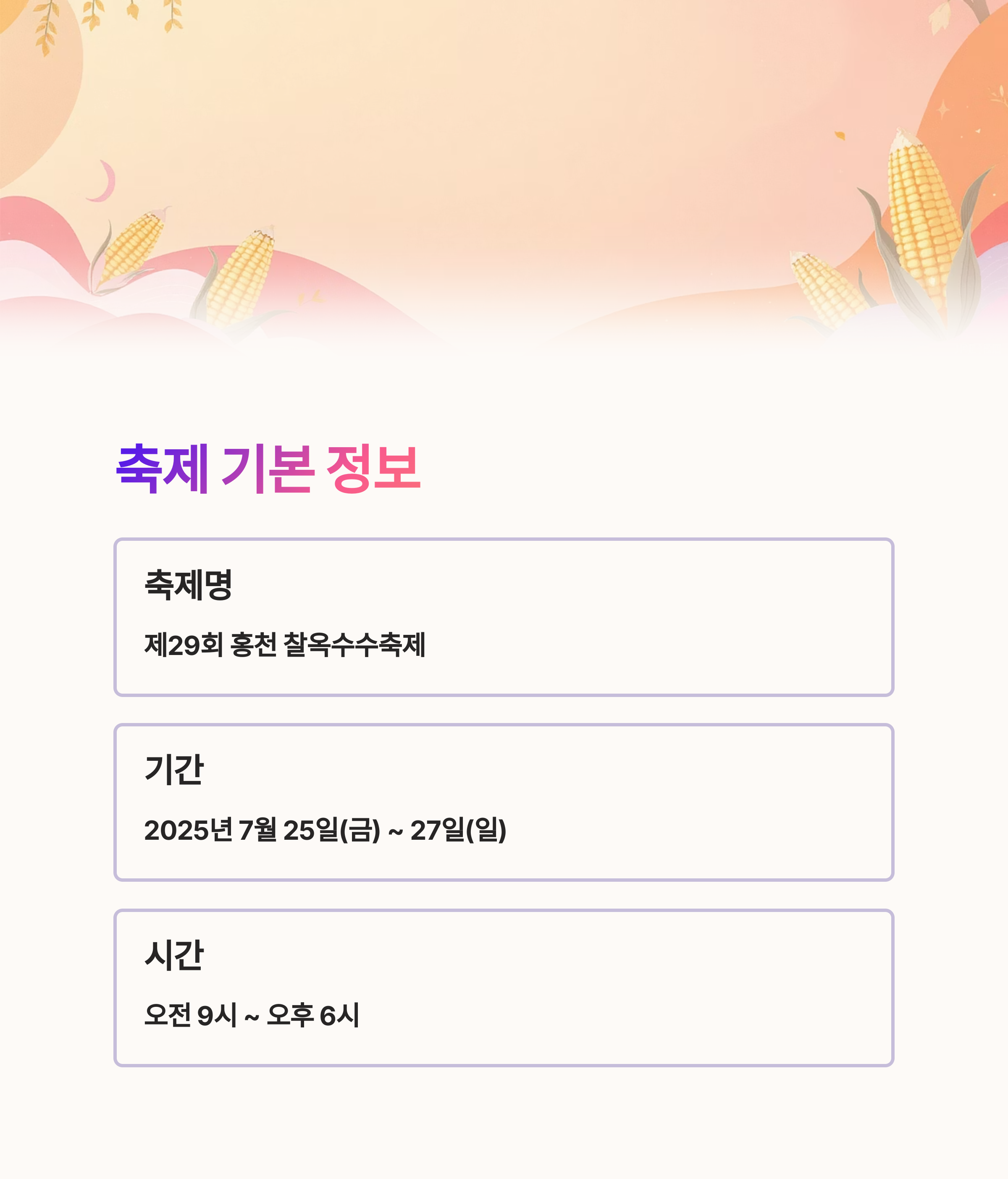 그래서 오늘은 2025 홍천 찰옥수수축제를 편리하게 즐길 수 있는 정보들을 나눠보겠습니다.