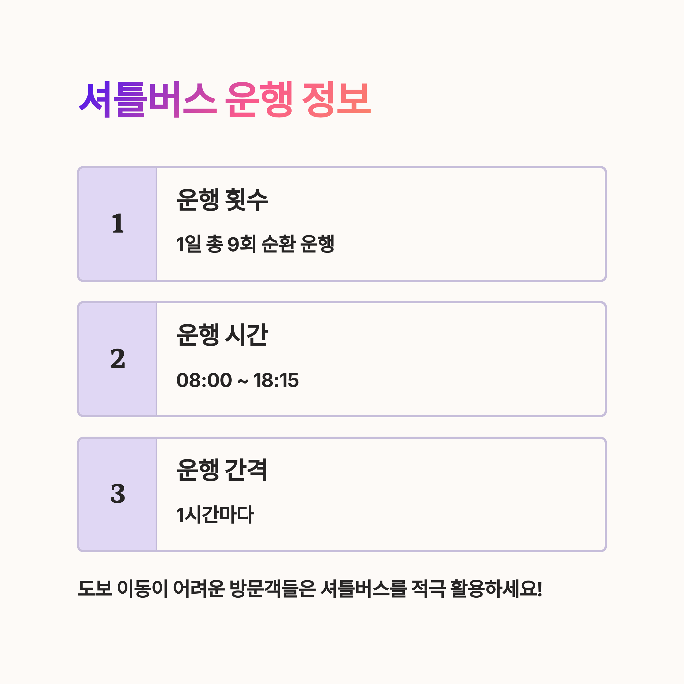 5. 도보 이동이 어려운 방문객들은 셔틀버스를 적극 활용하세요.