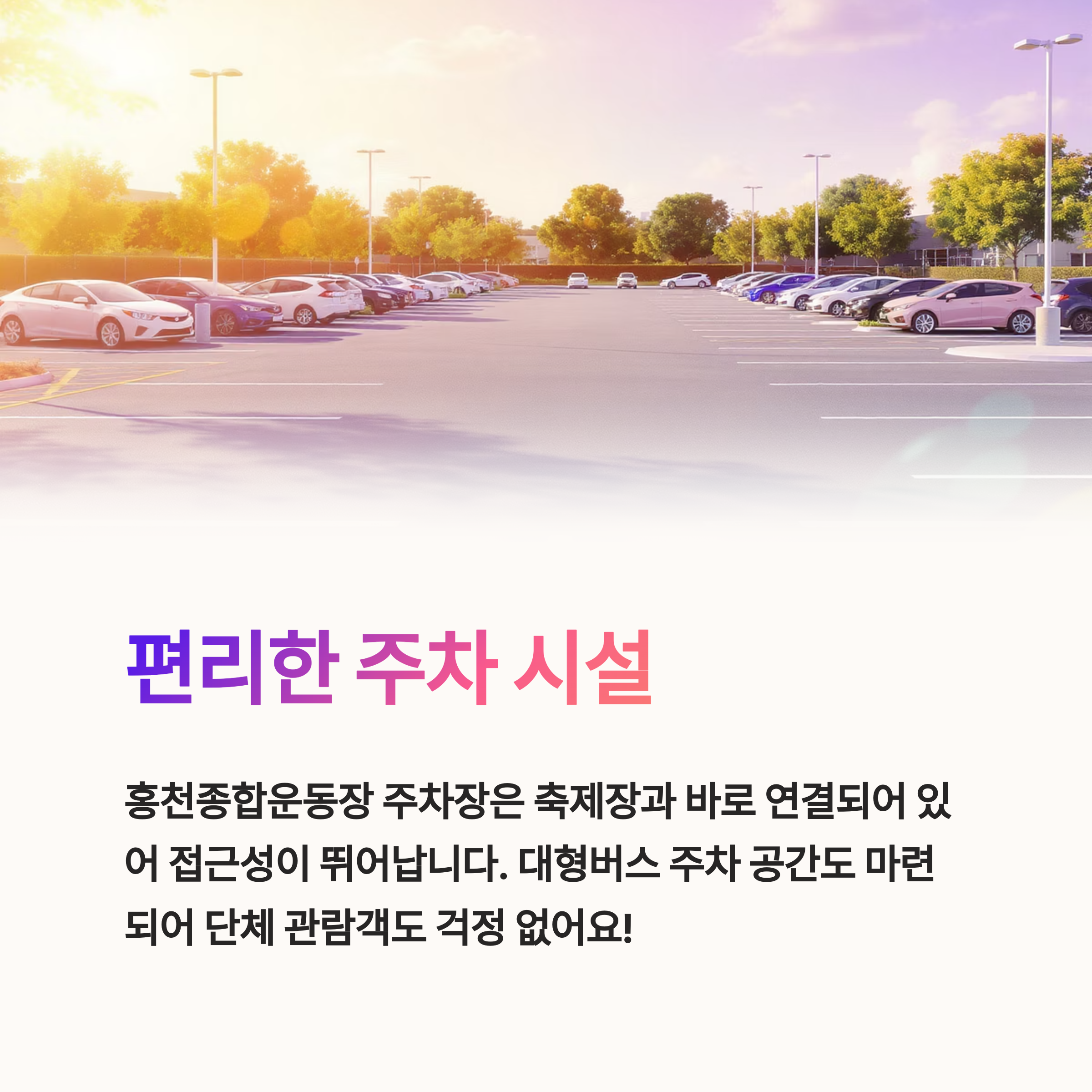 1. 홍천종합운동장은 축제장과 인접한 대형 주차시설을 제공합니다.